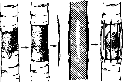 桥 接 一般在树液流动后可以剥离树皮的时期进行, 中国中部地区多在4月上、中旬桥接。采用插皮枝接(见枝接)方法,利用缺皮处下部附近的萌枝, 萌蘖为接穗就近桥接, 也可剪截健壮的一年生枝作接穗, 接穗插入部分削成马耳形, 枝干缺皮部的上、下两端或一端作“L”形, 或“T”形切口, 撬起树皮, 插入接穗, 绑缚固定。如用多年生枝作接穗, 可用小钉固定。涂抹接蜡, 用塑料薄膜包扎严实, 保护好接口。缺皮面积宽大的地方, 可环绕伤口, 行多枝平行桥接, 以利树势尽快恢复见图)。 桥接bridge grafting嫁接方法之一。借用嫁接枝条将树干或大枝伤损处上下两部连续起来,使营养物质通过接穗得以继续运送。其形似桥而得名。先将受伤或坏死部分刮削干净、平整,剪取本树种的一年生枝条剪成与伤口略长的接穗,两端削成楔形,用皮下腹接等方法,插接于枝、干伤口两端完好的皮部,嫁接时枝条不能倒置,接后涂接蜡。嫁接时期宜在砧木已开始树液流动,接穗尚处休眠状态时进行为宜。常用于修补或医治树木主干、根颈或大枝因机械损伤;兽类啮伤,病害、冻伤引起腐烂,以恢复树势。
