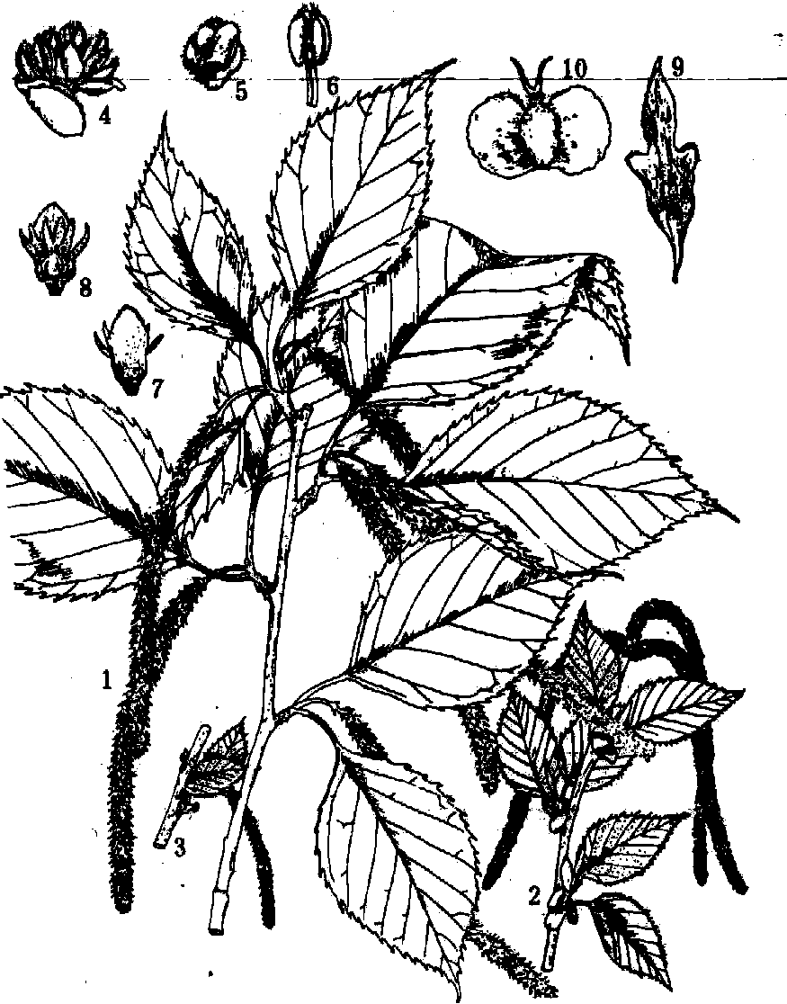 桦木科birch family;Betulaceae双子叶植物,落叶乔木或灌木。x=8,14。单叶,互生,多数有重锯齿;托叶早落,稀宿存。花单性同株;雄花组成下垂的柔荑花序,有苞鳞,有花被或无花被,雄蕊2~20枚,稀1枚,花粉具3或4~5孔,稀2或8孔;雌花组成圆柱形或球果状柔荑花序,每苞鳞有雌花2~3朵,每一雌花有1枚苞片和1~2枚小苞片,无花被或有与子房贴生的花被,子房2室或不完全2室,胚珠每室1~2枚。果穗圆柱形或卵圆形。果苞木质或革质,宿存或脱落,每一果苞内有2~3个扁平小坚果。种子无胚乳。共6属,140种,主产北温带。中国6属,70余种,分布北部、中部至西南部,虎榛子属(Ostryopsis)为中国特产,虎榛子(O.dayidiana Decne)树皮及叶可提栲胶,种子油供食用和制肥皂,枝可编制农具。桦木属常为北温带采伐迹地的先锋树种,常见的有白桦。桤木属为河岸护堤及水湿地区的重要造林树种,常见的油脂树种桤木,其果实含油量20.8%。多数的木材较轻软,为建筑、家具、火柴杆用材;木炭可制黑色火药;花粉为优良蜜源。 桦木科双子叶植物。落叶乔木或灌木。单叶互生,具柄,具锯齿、浅裂或全缘。花单性,雌雄同株,雄葇荑花序先叶开放,长而下垂。雌葇荑花序直立或下垂,雌花序无花被或有花被,子房下位。坚果或坚果具翅,种子单生。全世界产6属约150~200种,主要分布于美洲、亚洲和欧洲。中国产榛属、虎榛子属、鹅耳枥属、铁木属、赤杨属、桦木属等6属88种14变种。榛是优良干果,多数属是用材树种或园林观赏。 |