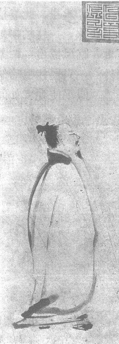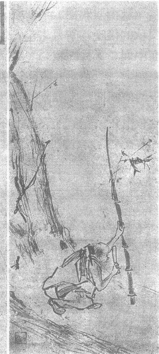 梁楷 《六祖斫竹图》 此卷表现的是六祖在山间伐竹的情景。作者选择这 一题材也是和禅宗提倡在日常行为操守中见性、顿悟的主张相吻合。画中六祖衣袖高挽,粗衣赤膊,砍起竹来也是恣肆放纵,任性自得。人物衣纹用折芦描写出,粗细顿挫分明,通过轻重、润涩、疾徐的变化,简练地概括出粗麻僧衣的特点。六祖面部、手臂用线细润流利,劈刀用线坚挺刚劲,竹杆则以没骨淡墨描出,背景仅以阔笔皴染出一角山石、几枝树木,笔简而意赅。体现出作者高妙的笔墨能力,以及对禅宗境界的深刻领悟和对画面整体意境的把握。 |