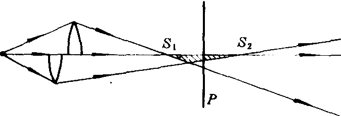 | 释义 | 梅斯林实验meisilin shiyan一种双光束分波面干涉实验。梅斯林(Meslin)所做。把一块凸透镜沿着直径切成两块半截透镜,再把两块半截透镜沿光轴方向移开一段距离。点光源S位于光轴上,它发出球面波,波阵面分别通过上下两块半截透镜,折射成两束光。若S通过两块半截透镜所成的实象为S1和S2,可以认为这两束光是分别从S1和S2发出的。两束光重叠的区域(图中阴影区)在S1和S2之间,并且位于光轴的一侧。把观察屏P垂直于光轴放在重叠区域内,屏上呈现两个点光源干涉的干涉图样,为同心半圆形明暗条纹。