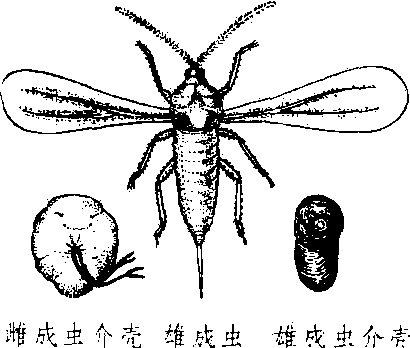 梨圆蚧 在梨树上,辽宁和河北年生2代,以2龄若虫越冬。翌年越冬代雄虫羽化期为5月下旬至6月下旬;雌成虫产仔期是6月下旬至7月中旬,盛期在7月上旬。第一代雄虫羽化期7月下旬至8月中旬;雌成虫产仔期8月至10月上旬,盛期在9月上旬。在浙江年生4代,雌成虫产仔期越冬代4月下旬至5月上旬,第一代6月下旬至7月底,第二代8月下旬至10月上旬,第三代11月中下旬。在苹果上,辽宁,河北,山东和河南年生3代,多以2龄若虫和少数受精雌成虫越冬。次年4月中旬雄虫化蛹,5月上、中旬羽化,交配后死亡。雌成虫产仔期为越冬代6月上、中旬至7月上旬,第一代7月下旬至9月上旬,第二代9月至11月上旬。世代重叠现象严重。捕食性天敌以红点唇瓢虫和肾斑唇瓢虫较重要。寄生性天敌有红圆蚧金黄蚜小蜂,短缘毛蚧小蜂等。应加强检疫,防止有虫苗木和接穗传播;果树休眠期喷洒波美5度石硫合剂或5%机油乳剂;雄虫羽化期和雌虫产仔期可喷有机磷制剂。 梨圆蚧San Jose scaleDiaspidiotus perniciosus(Comstock),又名梨枝圆盾蚧。昆虫纲,同翅目,盾蚧科。重要的国际植物检疫害虫之一。分布于中国东北、华北、华东、华中以及广东、广西、四川;大洋洲、夏威夷群岛、东亚其他地区、南非、美洲,西欧也有分布。寄主有苹果、梨、海棠、山楂、桃、李、杏、枣、榆、杨、柳。雌成虫体长0.91 ~1.48 mm,虫体扁圆形,黄色。雌介壳圆形,灰白色或灰褐色,有同心轮纹,壳点脐状,位于介壳中央或略偏,黄色或黄褐色。雄介壳长椭圆形,壳点位于介壳的一端(见图)。中国一年发生2~3代,多以若虫及少数受精雌虫在枝干上越冬。初孵若虫在小枝、果面爬行,选择合适部位,口针插入即固定不再移动。成、若虫主害枝条和果实。宜加强检疫,防止有虫苗木和接穗向外传带;保护利用天敌;做好果树休眠期及生长期的药剂防治工作。