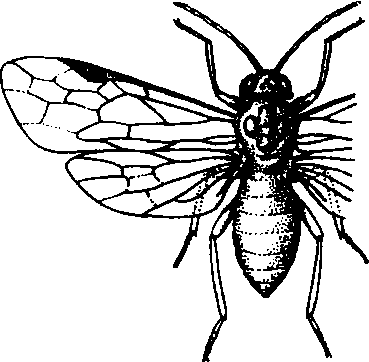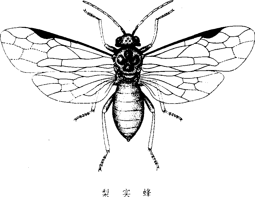 年生1代,专性滞育。以末龄幼虫在土内结茧越夏越冬,翌年早春杏花现蕾期化蛹,蛹期7天左右。羽化后,先上杏花取食,待梨花含苞,顺梨树品种花期先后次序转移产卵。以产卵器刺入花萼组织内每产1粒,花萼表面留一点黑褐粘液。卵期5~6天。幼虫孵化后先在花萼基部串食,后渐蛀入幼果心中。幼果将至干枯时,幼虫即行转移新果,从果顶钻入。一般1头幼虫可转移为害2~4个幼果。幼虫为害期约15天。末龄幼虫自行脱果落地,于土中作茧休眠。羽化前,即杏花现蕾期,在梨树下喷施辛硫磷,对硫磷微胶囊颗粒可触杀出土成虫;成虫盛发期每天早晨震落成虫,集中杀死; 成虫产卵后,经常摘除被害花和幼果,也可减轻危害。 梨实蜂pear fruit sawflyHoplocampa pyricola Ro-hwer,又称梨实叶蜂。昆虫纲,膜翅目,叶蜂科。分布于华北、西北、华东、华中以及辽宁、四川等省;朝鲜半岛也有分布。寄主仅为梨。成虫体长约4 mm,体浅黑褐色,具金属光泽。翅淡黄色透明,翅脉淡褐色(见图)。末龄幼虫体长约7.7 mm,体淡黄色。前胸、腹部1~8节两侧及腹端背面有一黄褐色斑纹,上有小黑点。中国一年发生1代,专性滞育,以末龄幼虫在土中作茧越夏越冬。成虫羽化出土期与杏、梨花物候期密切相关,成虫有假死性,卵产于梨花萼组织内。幼虫孵化后,先在萼筒内取食,色变黑,待梨花开后再转移至果实为害;有转果为害习性,老熟幼虫入土作茧越夏、越冬。以人工捕捉与喷洒农药为主要防治措施。