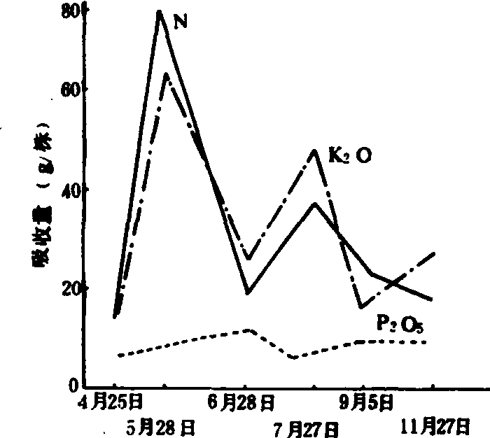 图2 鸭梨叶片和果实中Ca含量的变化 铁素(Fe) 石灰性土壤、滩涂盐碱沙荒地,梨树缺铁黄叶病相当普遍,即春季发芽晚,开花迟,新梢先端幼叶的叶脉绿色而叶肉全部黄色甚至白色,叶绿干枯,并呈“梢枯”。缺铁树生长势衰弱,严重时死亡。缺铁病因,不是土壤中全铁量低,而是土壤活性铁含量低。土壤活性铁含量与叶片叶绿素含量呈高度正相关。 硼素(B) 梨树的花芽,叶芽和幼果的发育都需要硼。缺硼时,春季花芽膨大或开绽期停止发育,芽的鳞片松散,里面的花器干缩;叶芽开绽期,新梢顶端叶芽开始干枯,其下部休眠芽陆续萌发,呈花序状,之后亦逐渐干枯,坐果率极低,生长不正常,果个小,果肉不均匀地木栓化,果面有凹陷,皱缩,果实畸形。 施肥技术 施肥时期 秋季有机肥作基肥,有利于根系吸收后作为贮藏营养以提供翌年春季萌芽开花和坐果之用,具体时间以断根后还能发出新根而地上部不再引起新梢的生长为宜。对生长特别旺盛的树,可以在早春作基肥施用,以减弱新梢生长势,促使幼树早结果。追肥的时期,氮肥宜在生长季前期,如辽宁锦西一带山区秋白梨,在同等施氮量(每100立方米冠积施氮2.25~2.50千克)条件下,两次追施比一次追施的增产效果好,这两次的时间是春季芽萌动期和初夏生理落果后,10年平均产量比不追施氮肥的增产39.0%。比其他时期追施一次肥的增产16.8%~20.8%,比生长季后期两次追施氮肥的增产11.2%(表1)。追施磷、钾肥的时期,以生理落果期到花芽分化开始期较好。硼、铁、钙的追施也以早期较好。