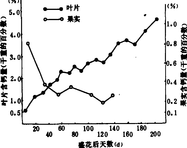 钙素(Ca) 年生长周期中,梨树叶片的含钙量,由春季展叶至秋季落叶呈逐渐增加的趋势;果实含钙量,由坐果至采收其绝对量不减,而相对浓度由大至小(图2)。尤其在盛花后,10~30天内,果实钙的浓度含量下降最快,果实生长的整个时期中,钙均能进入果实(中后期进入仍较多,这与苹果很不同),鸭梨果实90%的钙是盛花后60~140天进入的;然而由于最后梨果实干物质的增加高于进入的钙量,因此果实中钙的浓度并未上升。梨树缺钙时易引起苜蓿青、黑底、木栓斑等生理病害。