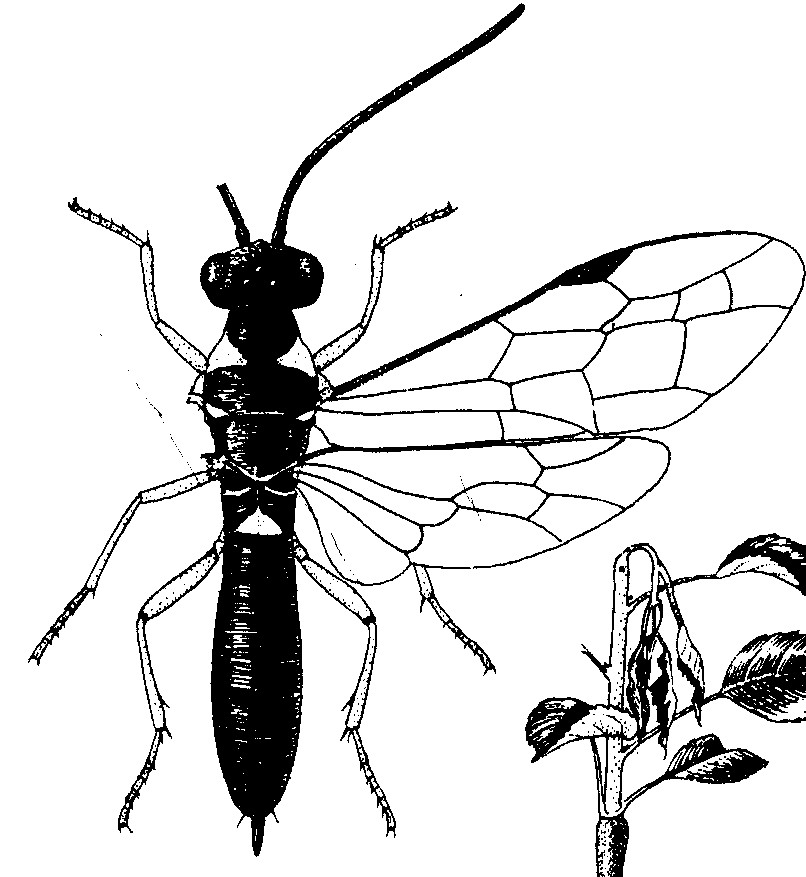 在河北二年发生1代。以幼虫及蛹在被害枝内越冬,春季梨树开花时羽化,花凋谢时成虫开始产卵为害。当新梢长出12~15厘米时,在新梢6厘米上下处锯梢产卵,然后在其下锯去3~4叶,只留叶柄。卵期约10天。幼虫由嫩枝髓部向下蛀食,受害枝干枯呈黑褐色。5月下旬蛀入到二年生枝附近,6月中旬几乎全部蛀入二年生枝内,8月上旬停止食害,作茧越冬。第二年继续休眠,9~10月化蛹后再次越冬,翌年羽化。葛氏梨茎蜂在河北年生1代,以末龄幼虫在被害的当年生枝内作茧越冬,翌年3月间化蛹,4月羽化。一般在鸭梨盛花后5天,新梢抽出约5~6厘米时开始在嫩梢上产卵为害,盛花后10天,当新梢大量抽出迅速生长时为产卵盛期,产卵时在新梢6厘米上下处锯梢产卵,产卵后将锯口下第一芽锯死,再锯下1~2叶,仅留叶柄。产卵期整齐,前后约半个月。卵期7天左右。成虫昼间活动,早晚及夜间停息在树冠下部新梢叶背面,对糖蜜及糖醋液无趋性,也无趋光性。天敌有啮小蜂(Tetrastichus sp.)。一般采用在成虫发生期喷施对硫磷、敌敌畏或敌百虫,人工剪除被害枝梢,早晚、阴天摇落捕杀成虫等方法防治。 梨茎蜂pear twig girdlerJanus piri Okamoto etMuramatsu,又名梨梢茎蜂、梨茎锯蜂。昆虫纲、膜翅目、茎蜂科。分布于俄罗斯、西欧及中国。寄主仅为梨。成虫体长9~10 mm,黑色,有光泽。前胸背板两侧后角、中胸侧板前部黄色。翅透明,足黄色。雌虫第7~9节腹面中央有纵沟,内有锯齿状产卵器。末龄幼虫体长11~12 mm,白色,头淡褐色。胸足退化,各体节侧板突出成扁平侧缘。体稍扁,头、胸部向下弯,尾端向上翘。中国一年发生1代或二年发生1代,以末龄幼虫在被害枝内越冬。成虫喜食花蜜,露水,但对糖蜜及糖醋液无趋性,也无趋光性。卵产于嫩梢内,产卵处上部的嫩梢和下部叶柄均切断,数日后干枯脱落,成一短小枝橛。幼虫共8龄,在嫩茎髓部蛀食,虫粪排于蛀孔内,最后被害部干枯。每一被害梢仅有幼虫一头。以剪除被害枝梢及喷洒对硫磷、敌敌畏、敌百虫等农药为主要防治措施。