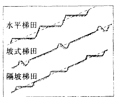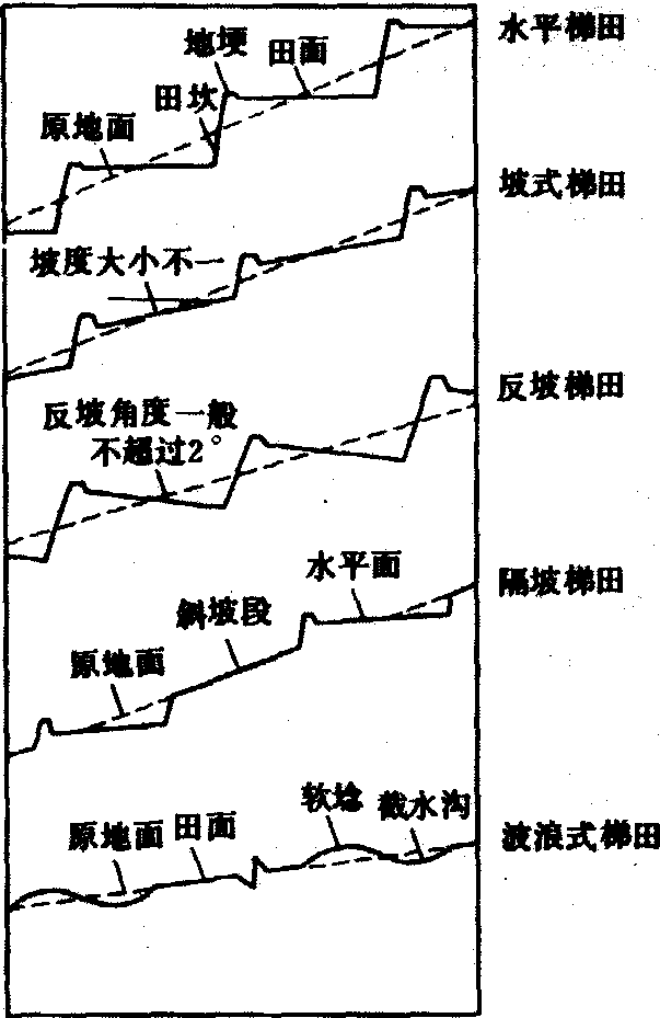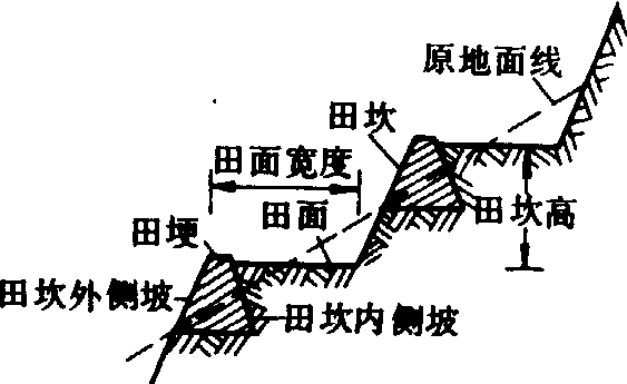 图2 梯田断面要素图 梯田的修建 采用如下步骤:❶定线。在一个耕作区内定出各台梯田的埂坎线和挖填分界线,地形复杂时可大弯就势,小弯取直,达到填挖土方量均衡和田面平衡。 ❷保留表土。可使梯田当年增产,常用的方法有逐台下翻、中间堆置与顺坡开沟三种,分别使用于陡坡、中坡和缓坡。 ❸田坎的修筑。为使坎基稳定,清基应至坚实的硬底土层;如系石基,应除去风化岩屑。修筑土坎,取用生土,先下切上垫,分层铺土踩实,坎面用铣扣土打实、拍光。拍打注意扣土接缝。要求坎顶水平,坚实不塌,修至设计高度,再筑20~30厘米高的地埂。修筑石坎,大石在下,小石在上,大面朝外,小面朝里,大石压顶,碎石填缝,条石平放,坎石压茬,圆石“品”砌,片石斜插,石缝错开,嵌实咬紧,切勿用土垫底,以土代石。 ❹坎内填土。修筑田坎与坎内填土同时进行,保持等高,灌溉梯田的填方区最好适当压实,以防灌水后沉陷。水稻梯田还应修筑防渗层。 梯田又名山田。将山坡斜地改造成梯状平地,以利蓄水保墒的耕地,远视状若梯蹬,故名。有泉植稻,无水种杂粮。山地广泛耕种始于北宋、盛于南宋、福建、江西、湖广、浙江一带为多。明清时期,流民奔往川陕鄂边区、闽浙赣边区、闽粤湘赣边区、苏南浙西边区梯山种田,多植玉米、蕃薯等杂粮,梯田又有所发展。由于梯田垦山过多,造成水土流失。特别是苏南浙西一带的梯田水土流失对太湖平原的农业造成较大危害,常常引至洪水泛滥。清嘉庆、道光之际,地方官员阻止开垦梯田之事屡有发生,但禁而不止,在一定程度上危及江南水乡的农业发展。 梯田terrace在坡地上分段沿等高线建造的阶梯式农田。是治理坡耕地水土流失的有效措施,蓄水、保土、增产作用十分显著。梯田的通风透光条件较好,有利于作物生长和营养物质的积累。按田面坡度不同而有水平梯田、坡式梯田、复式梯田等。梯田的宽度根据地面坡度大小、土层厚薄、耕作方式、劳力多少和经济条件而定,和灌排系统、交通道路统一规划。修筑梯田时宜保留表土,梯田修成后,配合深翻、增施有机肥料、种植适当的先锋作物等农业耕作措施,以加速土壤熟化,提高土壤肥力。 梯田为了保持水土,发展农、林、牧业生产,减少黄河下游泥沙淤积,将坡地改造成台阶式或波浪式断面平地的土地利用方式。坡地修成梯田在黄河流域有悠久的历史和丰富的经验。周代初期,在今陕西省关中土地开垦中,就有平整土地的活动。《诗经·小雅》中有“原隰既平,泉流既清”的诗句。宋代梯田得以推广。元朝至元年间王祯所著《农书》对梯田有较详细的记述。数千年的实践证明,坡耕地修成梯田后蓄水、保土、减蚀、增产效果十分显著。中华人民共和国成立后,坡地修梯田的技术,包括规划、设计、施工和管理等方面都有长足进步。近期根据不同的地势和使用目的,梯田修筑分为两大类:一类是沿等高线筑田坎,使相邻两坎间的田面相平;一类是在6度~7度以下的缓坡地每隔一定距离等高筑埝而成的一种断面为波浪式梯田。坡地修梯田是黄河流域改造坡耕地、控制水土流失、增加农业生产的根本措施。