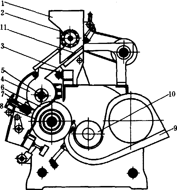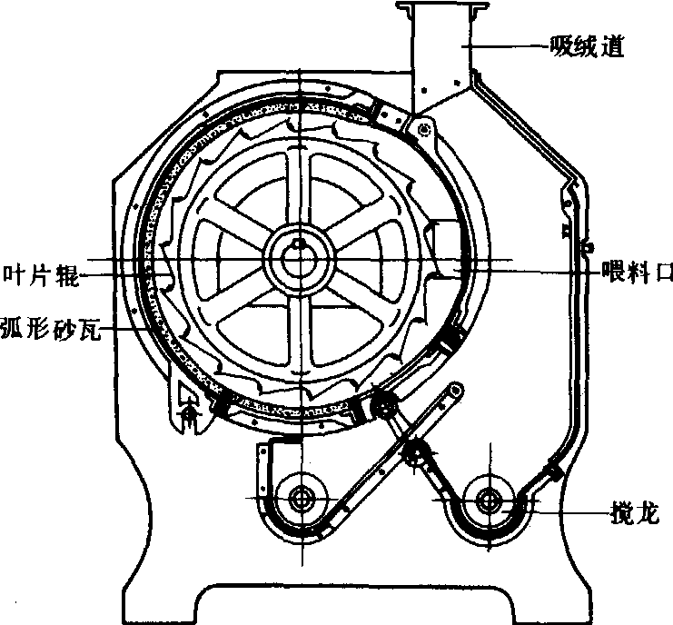 图1 气流式锯齿剥绒机 1.料斗;2.喂料辊;3.淌板;4.工作箱;5.拨子辊;6.锯片圆筒;7.棉子梳;8.肋条;9.短绒风道;10.搅龙;11.磁铁 气流吸绒可在吸绒同时吸走机器内的含尘空气,使之不在车间内扩散,有利于改善劳动条件,机构简单,造价低,多用于剥二、三道短绒。中国目前使用的锯齿剥绒机有6 MR-141、6MR 160-10、6 MR-141B、6 MR-71 A、6 MR 80-10型等。 磨料剥绒 磨料剥绒机(图2)剥绒原理是棉子在离心力作用与叶片辊推动下,使棉子紧贴弧型砂瓦移动。由于砂瓦为金刚砂制成,从棉子上磨削下短绒,然后由气流吸走。该机结构简单、用材省、造价低、维修方便。但只能剥二、三道短绒,磨料磨纯后剥下的短绒颜色变暗,色泽较差。在使用时须严格掌握金刚砂的粒度及硬度,才能保证短绒质量,减少动力消耗,同时,还要增加通风除尘系统。 不论采用哪种剥绒机,均要求棉子一般经剥绒机剥绒三道,要求头道轻剥,二道多剥,三道尽可能多剥,使棉子上短绒残留率不超过4%。一道绒(12毫米以上)占总出绒率的1%~1.5%,二道绒占50%~60%。一、二、三道绒分别为一、二、三类短绒,每类短绒又分3级。每个品级由短绒长度、色泽和光泽以及其他的特性所决定。不同类、级的短绒要分别打包、存放、交售。