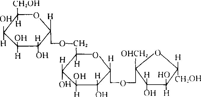 | 释义 | 棉籽糖raffinoseα-D-吡喃半乳糖与蔗糖去水缩合,以α1→6糖苷键连接而成的三糖。结构式如下。无还原性。被酸彻底水解为D-半乳糖、D-葡萄糖和D-果糖;被α-半乳糖苷酶水解为D-半乳糖和蔗糖;被β-果糖苷酶水解为D -果糖和蜜二糖。广泛存在于植物界,已在46个科的165种植物中发现。在棉籽、甜菜和桉树中含量很高。