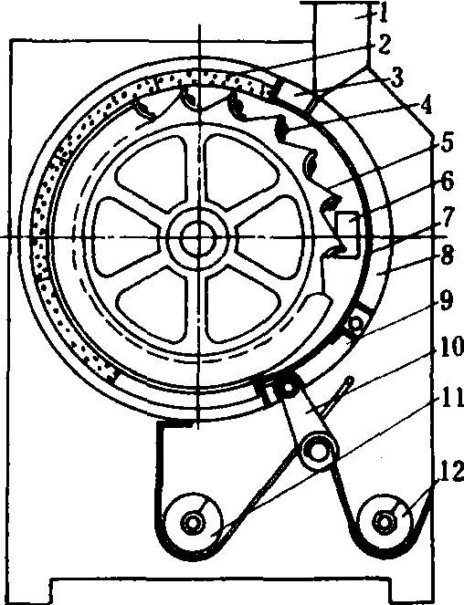 图2 磨料式脱绒机 1.吸绒道; 2.砂瓦; 3.连接盖板;4.叶片; 5.拨籽辊; 6.喂籽口; 7.筛网; 8.筛网架; 9.开箱架; 10.走动架; 11.排籽螺旋; 12.排杂螺旋 现代脱绒机朝着棉卷密度自动控制,工作厢液压操纵,大工作厢,大直径锯片,以及改变锯齿齿形等方向发展,这对提高单机的生产效率,自动化程度,产品质量,改善工人劳动强度和生产条件以及环境保护有其重大的意义。 |