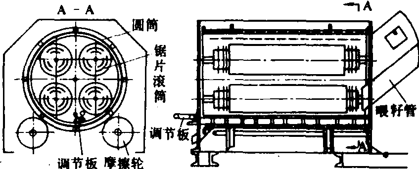 图1 圆筒式锯齿脱绒机 磨料式脱绒机 由若干块金刚砂组成的砂瓦工作面和拨籽叶片辊筒组成(图2)。在辐筒离心力和叶片推动下,棉籽紧贴金刚砂磨料的弧形表面移动,被金刚砂粒的边棱把短绒脱下,由气流吸绒道送至集绒装置,杂质坠落于排杂螺旋输送器排出机外,棉籽由出籽口排出。磨料脱绒机结构简单,维修方便,安全性能和劳动环境好;生产效率同锯齿剥绒机相近。但不能分道脱绒,脱出的头道短绒长度偏短,二、三道绒的长度也不易准确掌握,排出的棉籽光毛程度不够均匀。