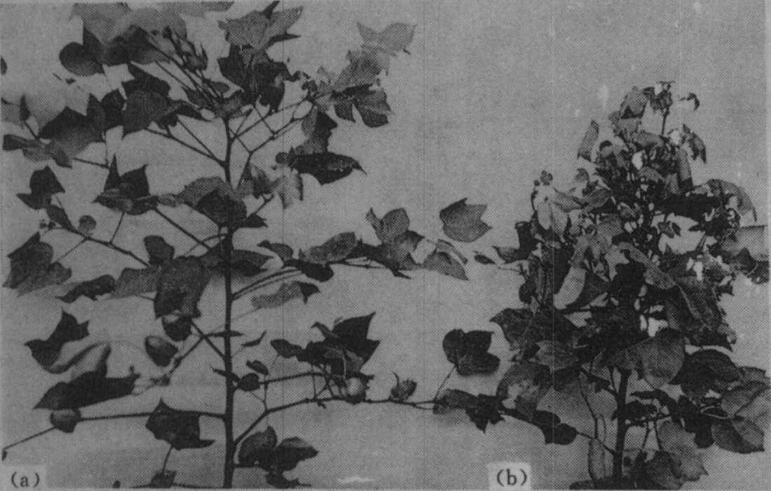 株形症状 严重缺硼时,棉株从子叶起即开始出现症状,子叶小而肥厚、色深,子叶叶柄下垂使苗株呈“个”形,与正常苗株子叶柄上挺使成“Y”形明显不同;顶芽受害,伸展不正常,真叶出现延迟;由于顶芽死亡,多量腋芽抽发,分枝及叶片增多,形成矮化型的多头棉;进入蕾期后,因顶芽受害,主茎伸长停滞,基部叶片显著增大,而上部新叶小而皱缩,节间短(见图1),株形紧缩,能现蕾,但幼蕾稍长大即变黄,苞叶张开并萎蔫脱落。