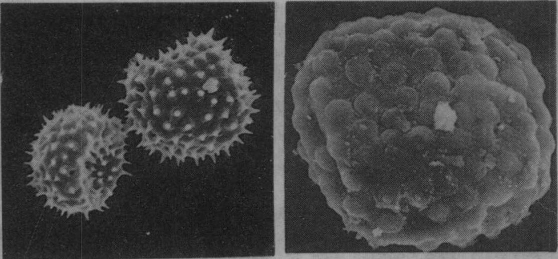 右:缺硼花粉粒突刺消失