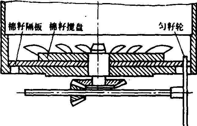 棉籽排种器的主要工作部件是棉籽搅盘和匀籽轮(图)。棉籽搅盘安装在种子筒底上作水平回转,对棉籽进行搅拌疏松,防止种子在筒内架空,并向排种口连续供籽。匀籽轮安装在排种口下方作垂直回转,其齿爪伸入排种口以上,抓取棉籽进行强制排种,提供连续而均匀的种子流。