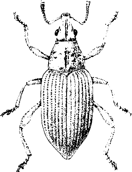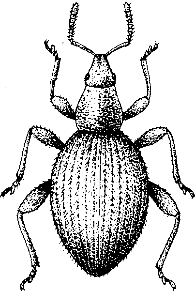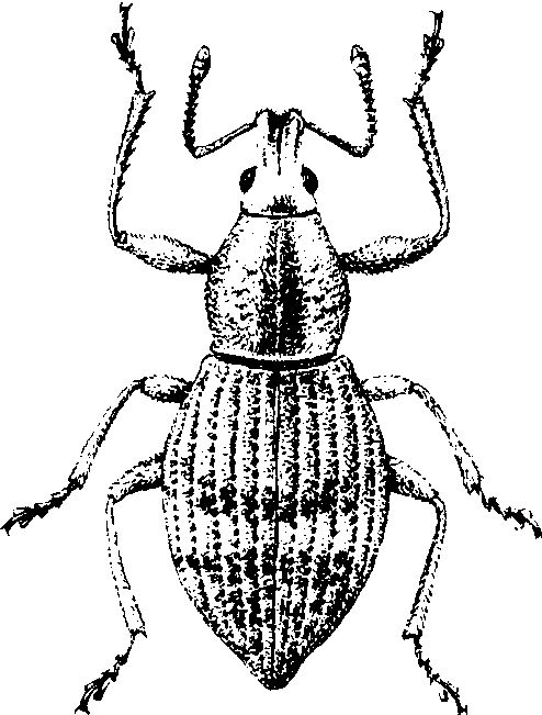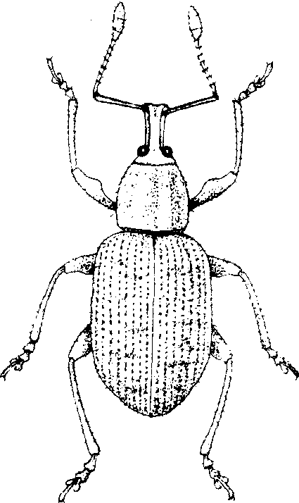蓝绿象 学名Hypomeces squamosus Fabricius。分布于长江流域及华南棉区。寄主有棉花、桑、茶、咖啡、松苗、玉米、甘蔗等,也取食杂草。成虫体长15~18毫米,纺锤形,黑色,表面密被翠绿、绿、金黄及灰色相间的鳞片和灰白茸毛。喙粗宽,端部鞘窄,前胸前窄后宽,中央有一宽纵沟。鞘翅基部最宽向后渐尖,每鞘翅有10条刻点沟(图4)。长江流域年生1代,华南2代。成虫4月出现,7~9月发生最多。成虫有群集性和假死性。