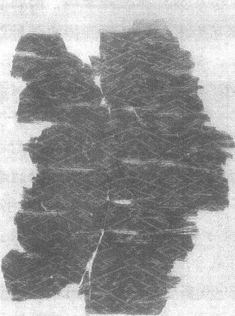 | 释义 | 棕地褐红黄色几何纹锦战国。长32.5厘米,宽23.3厘米。湖南省长沙市左家塘楚墓出土。湖南省博物馆藏。经锦,又称“经丝彩色显花”,这种锦是纬线只用一种色线,经线用多色线,由经线织成花纹的织物。此件经锦是在深棕色地上,用褐、红、黄三色经线以三上一下的组织提花,显出菱形线条框架,菱形重合连接,或整或破,大小相错组合而成,变化莫测,颇有楚地几何纹锦图案的传统风格。其经纬密度,经线每厘米69根,直径为0.26毫米,纬线每厘米20根,直径为0.2毫米。