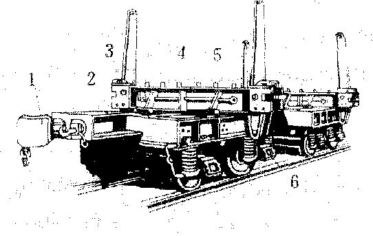 图2 平板车 联结装置 将车辆联结到一起并承受车辆之间牵引和碰撞力的一种装置。两辆车互相联结时分别与对方的挂钩、链环联挂,摘钩时分别将两组链环摘下,链环中有一环是三角形,转动三角形链环即可使链环伸长以便于摘挂,挂钩后转动90°减少冲击间隙。碰头板承受碰撞力,并保证在曲线运行时有足够的接触面。当牵引和碰撞时弹簧和套筒能起到缓冲作用。均衡板是将钩、链、牵引杆连接到一起的构件,牵引时将力传给牵引杆,并使左右的拉力均衡。冲击座是牵引杆的导框,在牵引力或碰撞力过大时能将力传递给车架。当牵引杆折断或螺帽失效时,安全链能防止列车脱节。这种牵引联结装置的优点是构造简单,通过曲线的性能较好。缺点是用手摘挂易出现人身事故,摘挂钩时往往需要用机车对钩,延长了调车作业时间。 转向架 车辆行走、减震和转向的组合体。平板车转向架与宽轨车辆的转向架相似。20吨台车转向架(图1)是车架、弹簧和走行部分连接在 一起的组件,是台车的主要组成部分,上面设有心盘与转向梁铰接,两端安装联结装置,车架中间安装制动装置。 制动装置 车辆减速或停车的一种装置。一辆车有手动制动和机动制动两部分。运材车辆的机动制动俗称碰头闸。碰头闸的连接架与联结装置的牵引杆尾部相连接,当机车施行制动时,车辆联结装置的牵引杆在压缩缓冲弹簧的同时沿箭头方向移动,连接架也沿箭头方向移动,从而各杆件发生移动使闸瓦压向车轮而制动。机车的制动力越大则连接架的作用力也越大。从而闸瓦的压力越大,车辆的制动力也越大。机车缓解制动时,受缓冲弹簧的复原作用和闸瓦的重力作用,连接架恢复原位,车辆的制动被缓解。顶块通过手柄操纵可以使之呈立起和放平两个位置,重车时立起以增大连接架的移动量,增大制动力;空车时放平以减少连接架的移动量,减少制动力。手制动为螺旋式,转动手柄后使螺母移动,从而带动各杆件施行制动和缓解,多用于车辆停放、调车作业和长大坡道上的制动。该制动装置的优点是构造简单,缺点是制动效果和可靠性较差。 |