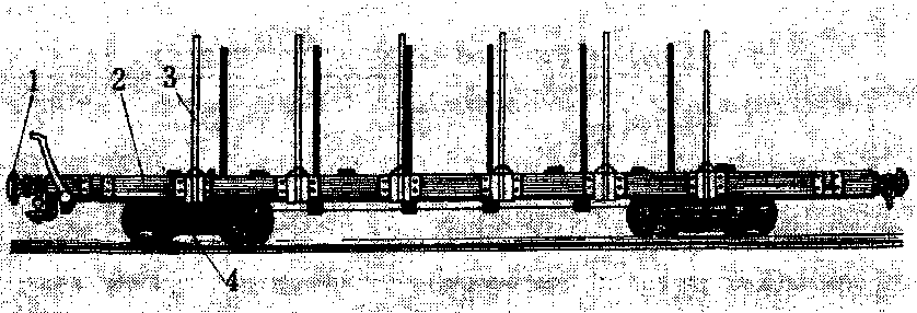 图1 20吨台车 ❷平板车:主要用于原木运输。车体上面为平板形,两侧设若干对钢制车立柱,两端设联结装置(图2)。载重15吨,车架长10米,宽1.8米,自重7.6吨。