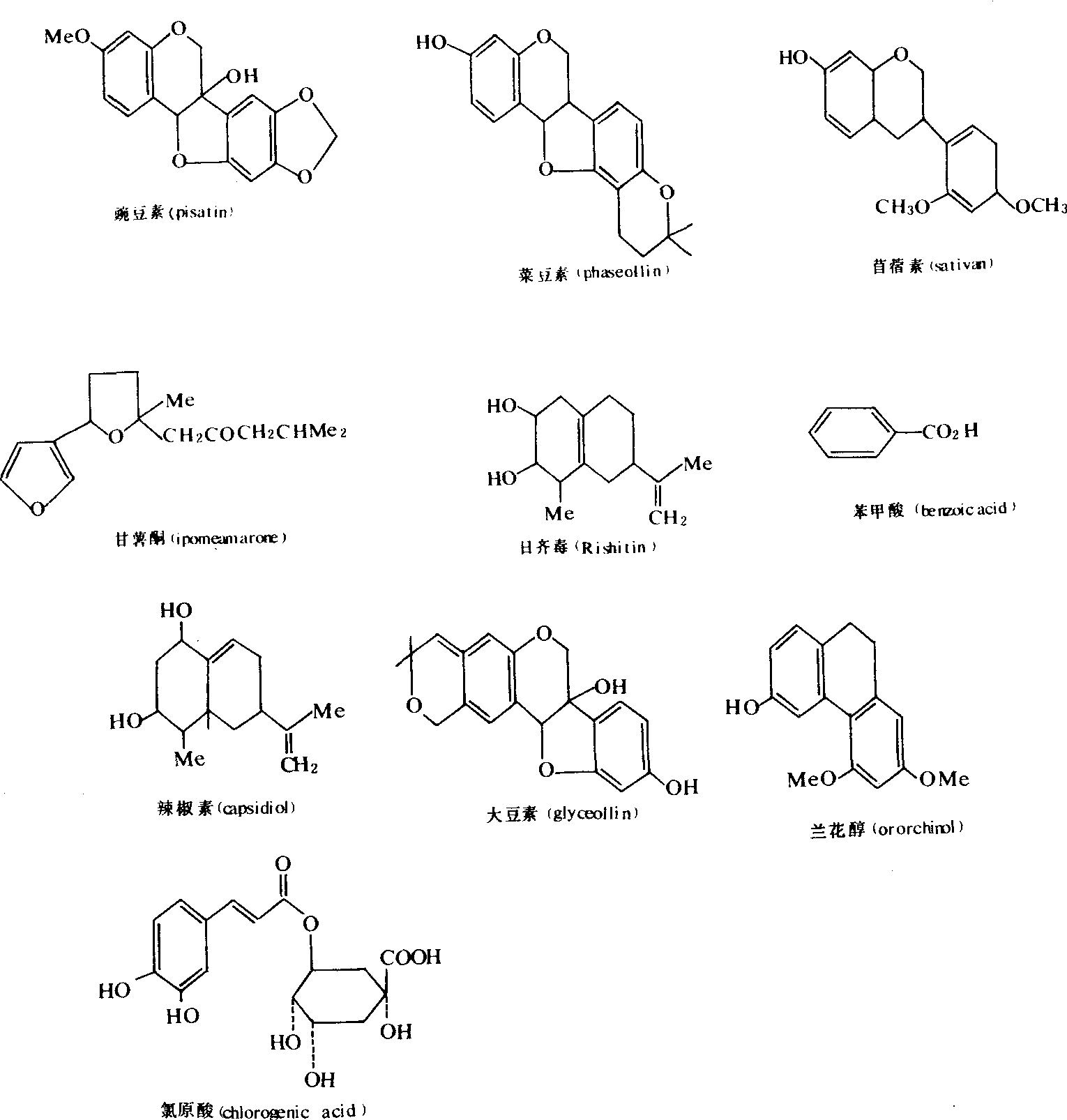 图3 甘薯酮的生物合成途径 植物也可代谢植保素,在苜蓿中曾证实梅的卡品可被代谢转化为异黄酮维斯的拖。和真菌的代谢一样,菜豆能使菜豆素转化为菜豆素异黄酮。辣椒可代谢辣椒素使13位碳直接羟基化。马铃薯能将日齐素代谢为二个毒性较低的产物。甘薯可将甘薯酮代谢为4-羟基甘薯酮。 总之,植保素可能在某些寄主—病原物系统中起一种作用,如大豆—大雄疫霉系统。而在许多寄主—病原物相互作用中,植保素和抗病的关系还不明确,至今还不是一个普遍的规律。 植物保卫素phytoalexin又称植物防卫素。植物低分子量的抗菌性代谢产物。在健康植株中其含量甚微,当遭受病原物侵染或某些生理、物理因素刺激后,引发其产生机构或阻遏其降解机构,从而迅速合成或积累到较高水平。1940年,最早在接种晚疫病菌的马铃薯块茎中发现这类物质,现已证实21科100余种植物都能合成。迄今已确定了90余种植物保卫素的化学结构。植物保卫素对真菌的抗菌作用最强,对细菌、线虫、高等植物和动物也可能有毒性。多数保卫素是类黄酮和类萜化合物,著名的有日齐素(rishitin)、豌豆素(pisatin) 、菜豆素(pha-seollin)、大豆素(glyceollin)等。 |