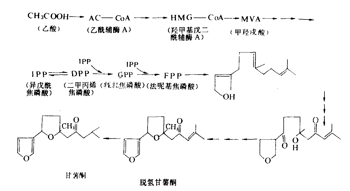 图2 类黄酮植保素生物合成途径 萜类 主要从茄科的马铃薯和旋花科的甘薯中获得。典型的有甘薯酮、日齐素和辣椒素等。甘薯感染黑斑病菌发生黑斑病后,体内萜类植保素增加,其量和染病部位的距离有关,越接近感病部位含量越多。抗病性强的品种较抗病性弱的品种含量高。马铃薯块茎感染马铃薯晚疫病菌后,可分离得到日齐素,在块茎及叶柄组织中,抗病品种较感病品种积累速度更快,量更大。萜类植保素的生物合成途径是乙酸—甲瓦龙酸途径。甘薯酮的合成途径图3。 激发子 来源于病原物的化合物(病原物的水解、热水浸提物及胞壁物质等),在植物体内可激发与病原物作用相同的反应,产生并积累植保素。例如用大豆大雄疫霉的激发子处理培养6~8天的大豆子叶,能积累大豆素。用豆炭疽病菌、大豆大雄疫霉、灰霉病菌的激发子处理菜豆的悬浮细胞,积累菜豆素。根据植物和病原物相互作用的研究,激发的作用方式有4种类型: ❶病原物直接产生激发子被植物细胞识别,受体的位置位于细胞的质膜上,如大豆。 ❷病原物的酶使寄主细胞壁降解所释放的细胞壁组分,激发植物产生植保素,例如软腐细菌及根霉菌的内聚半乳糖酸裂解酶及其它真菌释放的果胶酶有此作用。 ❸植物酶作用于病原物所释放细胞壁物质,激发植物产生植保素。如在大豆中分离到β—1,3-内葡聚糖酶能使疫霉菌细胞壁释放具激发子活性组分。 ❹植物细胞受各种刺激后所形成或释放的内源激发子化合物。它们可能部分和来源于因真菌酶释放的植物细胞壁组分相同,如部分酸水解或热水提取植物细胞,从细胞壁获得的具有激发子活性的寡糖。细胞受伤后也会释放具激发子活性的代谢物。激发子的作用机制还不很清楚,有的认为植物细胞来源的小分子化合物在细胞间传递方面起作用;也有认为激发子过程可能包含第二信使的作用,这些化合物从质膜传递信号,启动酶的转录和翻译。 代谢与调控 病原真菌及产生植保素的植物均能代谢植保素,有时植保素在植物体内的转换率对调节受侵组织中植保素的积累起主要作用。真菌代谢植保素的途径是多样化的,绝大多数已知真菌代谢植保素是通过氧化作用、水合作用、羰基还原作用或醚的裂解产生新的羟基以及去甲基作用,并转化为低毒、极性大的产物,有时代谢变化不仅增加极性,也改变分子性状。已证明单氧化酶常常起作用。茄镰孢菜豆专化型代谢菜豆素,以及血球状丛刺壳菌代谢豌豆素表现去甲基作用。灰霉病菌能代谢维罗尼及维罗尼环氧化物,还原为相应的醇。倍半萜鲁必敏已被还原为醇。辣椒素可被灰霉病菌及尖镰孢菌氧化为辣椒酮。植保素毒性和结构的关系,病原物代谢植保素的能力和致病性之间关系十分复杂,不是简单的相关性。病原物代谢寄主植保素在病害中是否起重要作用尚不清楚。植保素对许多病原物有毒,但不同种真菌对植保素敏感性显著不同,这与代谢去毒能力有关。用遗传分析的方法得知,不能代谢豌豆素使之去甲基的菌株,对植保素较敏感,对豌豆不致病或表现低毒。对豌豆具高度或中度低毒性的菌株,能使豌豆素去甲基,并能忍受豌豆素。但也有些低毒性的菌株能忍受豌豆素并使之去甲基,表明只以去甲基作用来说明病菌对豌豆的毒性是不够的,还应考虑毒性基因也是参与作用的。一般认为真菌对植保素的代谢是毒性所必需的特性。