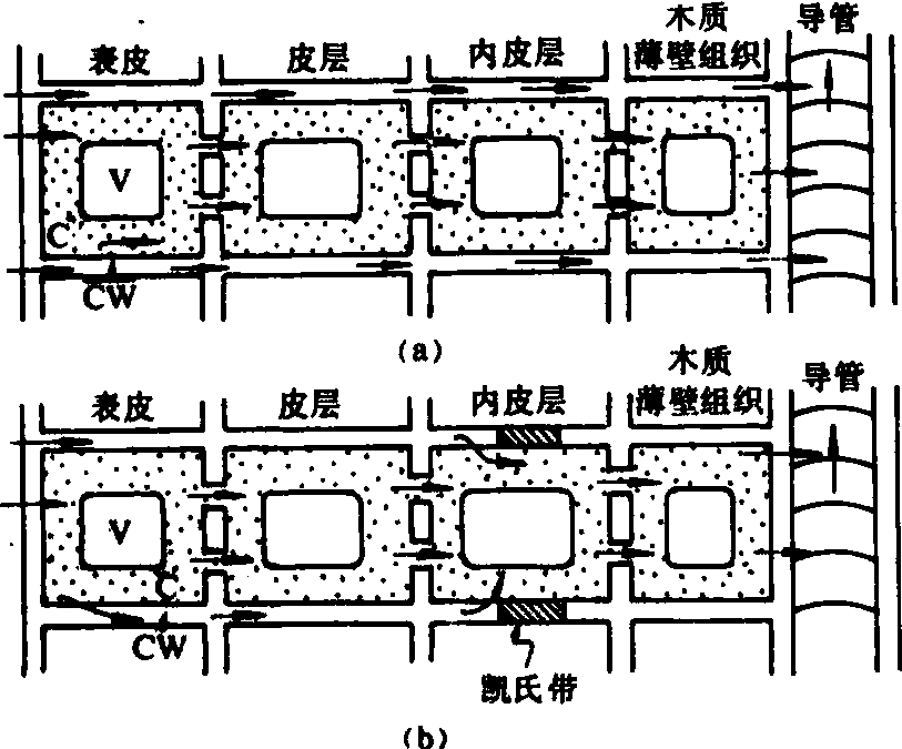 (a)内皮层未形成凯氏带的幼根;(b)内皮层已形成凯氏带的根