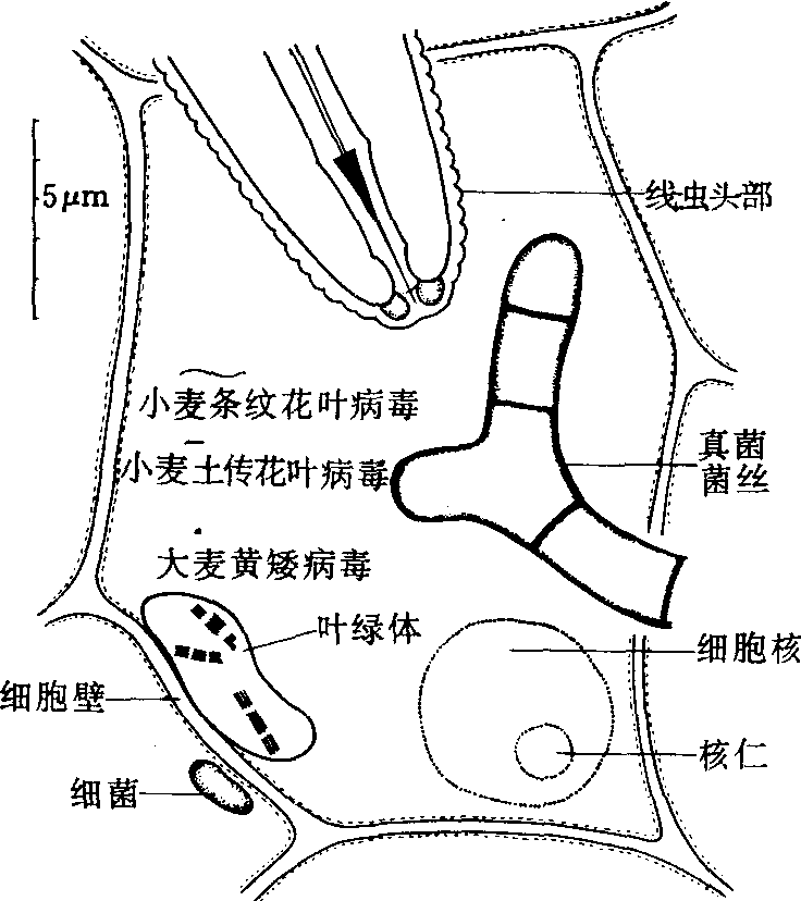 图示寄主植物一个细胞内不同种类病原生物的形态、大小及其与寄主细胞的大小比例。