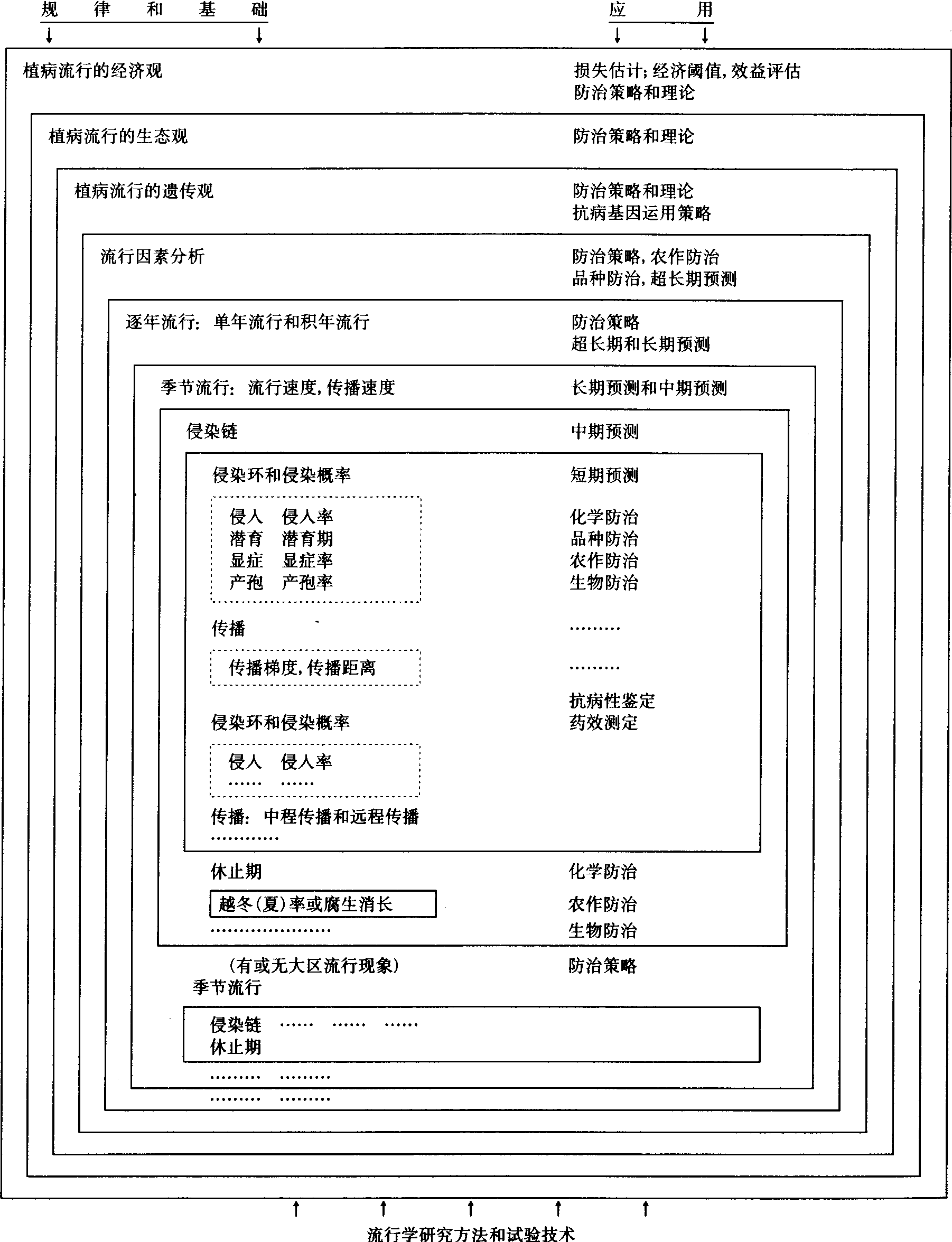 植病流行学的内容体系尚在发展中。现将上述研究内容按其层次和对应关系,图解如下页。
