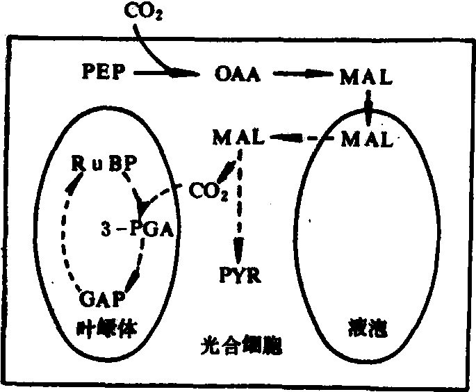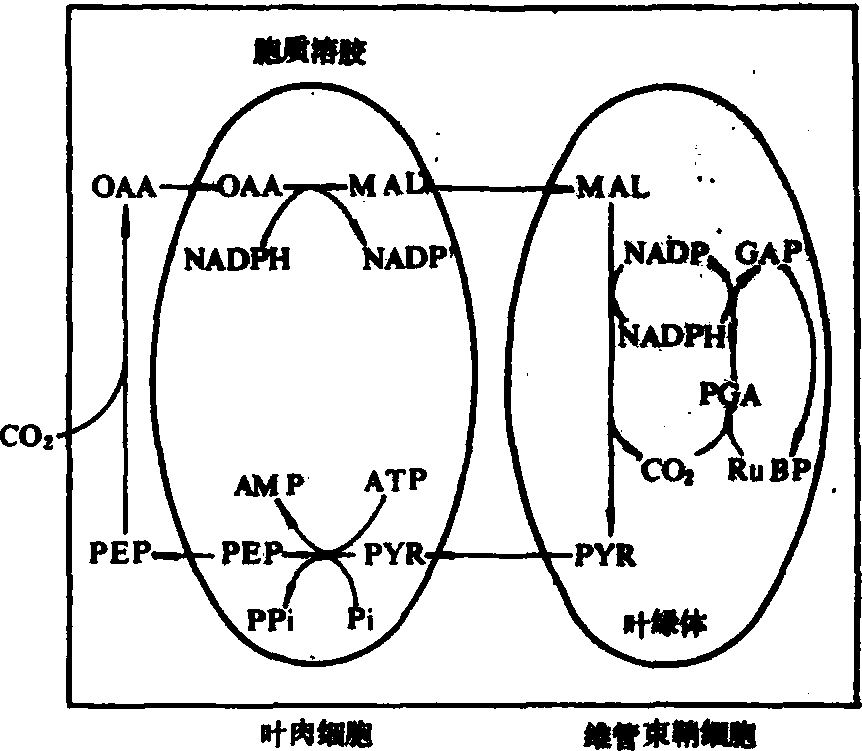 C4植物 在光合作用中吸收CO2后最初形成的产物为草酰乙酸,它含有四个碳原子,故称C4植物。这类植物多起源于热带,其中包含很多生活力很强的杂草。农作物中的玉米、高粱和甘蔗也属于C4植物。这类植物在解剖结构和生理方面都有其特点,围绕着维管束具有两层不同结构和生理功能的光合细胞,其内层为维管束鞘细胞,外层为叶肉细胞。进行光合作用时,先在叶肉细胞内固定CO2,形成C4-二羧酸。C4-二羧酸从叶肉细胞转移到维管束鞘细胞,在那里脱羧,又释放出CO2,所释放的CO2即进入维管束鞘细胞内的光合碳循环。按维管束鞘细胞内催化脱羧反应的酶的种类不同,C4植物又分为三类:❶通过NADP专一的苹果酸酶脱羧的植物为NADP-ME型。例如玉米、高粱、甘蔗; ❷通过NAD专一的苹果酸酶脱羧的植物为NAD-ME型。例如稷、马齿苋; ❸通过PEP羧激酶脱羧的植物为PCK羧激酶类型。例如大黍、虎尾草。图3所示玉米、高粱、甘蔗(NADP-ME型的C4植物)的CO2同化途径。 由于C4植物在光合作用中叶肉细胞及维管束鞘细胞内的不同酶作用的相互联系、相互配合,使其在环境中CO2浓度较低时仍能将CO2运入维管束鞘细胞,起着“CO2泵”的作用。在维管束鞘细胞中较高浓度的CO2促进RuBP羧化反应,而抑制RuBP的加氧反应,从而促进光合作用而抑制光呼吸。C4植物的光呼吸很弱,在光下几乎测不出光呼吸放出的CO2,其CO2补偿点也较低。CO2补偿点是指在光下光合作用中吸收的CO2量与呼吸作用中释放的CO2量达平衡时环境中的CO2浓度。而C3植物的光呼吸则远较C4植物强度高,其CO2补偿点也较高,可达50毫克/千克左右。C4植物的CO2补偿点仅0~5毫克/千克左右。即在光下,CO2浓度约在0~5毫克/千克以上时就可积累光合产物或用于生长,但C3植物则需更高的CO2浓度。
