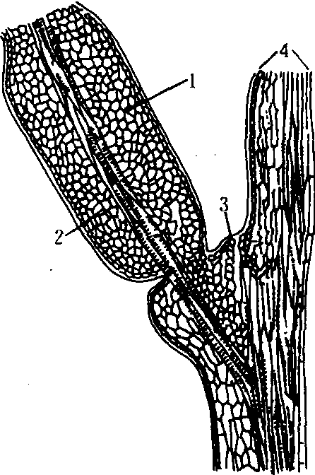 1、2. 叶枕上下两侧的薄壁细胞;3. 腋芽; 4. 茎
