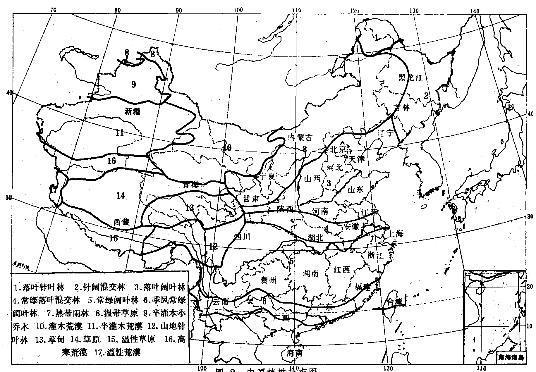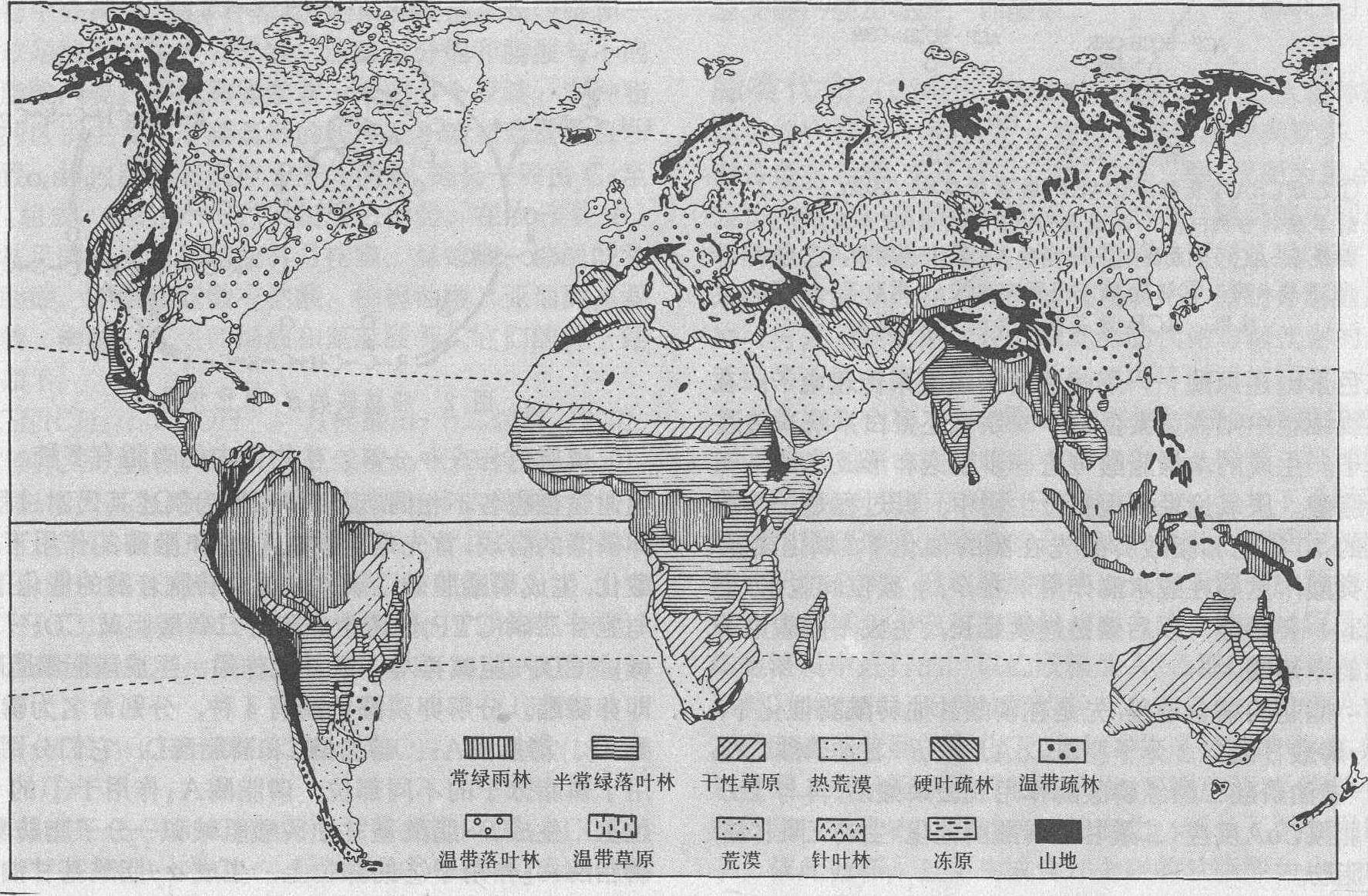 图 1 世界植被分布图 热带雨林和红树林 热带雨林分布在终年高温多雨的赤道气候带,是地球上种类成分最丰富的一种植被类型,林内乔木、灌木、草本、藤本以及附生、寄生植物种类丰富,成层现象复杂,优势种不明显,终年常绿,生长和繁殖终年持续不断,板状根、茎花现象和绞杀植物等都是热带雨林的特征。南美亚马孙河流域和赤道非洲的西部,中美洲的东部,印度西南沿海,中印半岛的西部为世界热带雨林主要分布地区。中国的台湾南部、海南省、云南南部、西藏东南部的低山河谷地区,以及许多热带岛屿上出现非典型的热带雨林。红树林主要分布在热带季风海岸淤泥滩上,在远离赤道的32°N和44°S附近也有零星分布。红树林以红树科、马鞭草科或海桑科为主,密集的支柱根、特殊的板状根和呼吸根以及“胎生”的繁殖方式是其特征。从亚洲的马来半岛、大巽他群岛,直至日本南部(九州),以及澳大利亚大陆北部,非洲东岸的坦桑尼亚和莫桑比克之间,喀麦隆和刚果河口,美洲的佛罗里达半岛南部,墨西哥湾沿岸均有红树林分布。中国浙江、福建、广东、广西、海南和台湾等省区沿海也有少量分布。 季雨林和稀树草原 季雨林分布在热带季风气候区有周期性干湿季节交替的地方。旱季降水少,温差大,群落或多或少是落叶或全部落叶的,季相明显,在亚洲、非洲和美洲等季风热带地区,季雨林呈不连续分布,如印度的德干高原,缅甸、泰国、老挝、越南等地的干热河谷和盆地,在印度尼西亚的加里曼丹、苏拉威西、伊里安、帝汶等岛屿中受干燥季风影响的地方,其分布北界大体上与热带界线相符合,柚木林是其中的一类。中国台湾、广东、广西、云南和西藏等局部地区也有季雨林分布,其中如青皮、木棉、擎天树等为标志种类。稀树草原亦称萨王纳群落,是一种热带型的旱生草本群落,其中稀疏地生长着旱生的乔木或灌木。全年气候干热,降水不均,主要分布在非洲撒哈拉大沙漠的南部,南美洲巴西东部和委内瑞拉、圭亚那等地的热带范围内,草本植物有禾本科的须芒草属,黍属和龙胆科的绿草属等。旱生乔木树种如伞状金合欢、猴面包树、纺锤树等。在澳大利亚和亚洲也有分布。中国的稀树草原主要分布在云南、广东、海南等省的山间峡谷低丘陵和海滨台地上以及云南、贵州、广西等省区的亚热带山地干热河谷地区,大多数属次生植被性质。 常绿阔叶林 分布在亚热带温暖湿润的季风气候区内,夏季炎热而潮湿,冬季稍微干寒,如非洲的加那利群岛和马德拉群岛,美洲的佛罗里达,墨西哥的北部和巴西的东南部。植被主要由壳斗科、樟科、山茶科、木兰科等树种组成,终年常绿,林相整齐,多数草质的叶面被蜡层,且常与光线照射方向垂直,又称照叶林。中国是亚洲常绿阔叶林发育最典型并有大面积分布的区域,竹林、杉木林、柳杉林都是亚热带森林植被的重要类型之一。此外,常绿阔叶林在日本、朝鲜南部和大洋洲也有分布。 落叶阔叶林 又称夏绿阔叶林,是温带湿润海洋气候条件下的地带性植被类型。生长季节内有适宜的降水,但冬季较长且比较寒冷,树木落叶,群落外貌有明显的季相更替,乔木一般具有宽阔的叶片,以栎属、山毛榉属、桦属、槭属等较为常见,主要分布在北美大西洋沿岸、西欧和中欧海洋性气候的温暖区域以及亚洲东部、中国华北、朝鲜和日本等地。 针叶林 属于寒温带的地带性植被类型。夏季温暖潮湿,冬季严寒,由大多具针状叶的松杉类植物和松属、云杉属、冷杉属、落叶松属等树种构成纯林或混交林,主要分布在北半球高纬度地带或亚热带高山亚高山上。无论欧亚大陆或北美,针叶林都很发达,从温带起向北延伸,连成非常宽广的地带,一直达到森林的北界,通称泰加群落。南半球的针叶林很少,大都出现在山区。 草原 以多年生旱生禾草植物占优势的草本植物群落,属于温带大陆性气候下的地带性植被类型。草原地区气候干燥,雨量少而变率大,且多集中在温暖的夏季。冬季寒长。禾本科、豆科等植物占优势,其中针茅属为最典型的丛生禾草。此外,菊科、藜科和其他杂类草也占重要地位,季相更替明显。欧亚大陆的草原从匈牙利多瑙河下游起,经黑海沿岸横贯苏联西伯利亚、蒙古,一直延伸到中国的黄土高原西北部、内蒙古高原和松辽平原,通称为干草原;北美草原分布在密西西比平原以西与落基山脉之间; 南美草原分布在阿根廷和乌拉圭的大部地区,其他如南非的桔河上游以及澳洲、新西兰等处也有小面积分布。 荒漠 分布在亚热带和温带极端干燥的大陆性气候地区的植被类型,称为荒漠植被。荒漠地区降水稀少,蒸发量大,夏季温度高且温差显著。旱生植物、短生植物和盐生植物是荒漠植物区系的几种生态适应类型,如梭梭属,麻黄属,沙拐枣属,盐爪爪属等。荒漠在北半球有明显的地带性分布,世界著名的荒漠有非洲撒哈拉大沙漠,亚洲的戈壁大沙漠,以及北美西部的荒漠; 在南半球,有澳大利亚大陆中部的沙漠,南美东南(阿根廷境内)和西部(智利境内)以及南部的荒漠。中国西北地区的荒漠属于温带荒漠,以超旱生的小半灌木、灌木构成稀疏植被为主,另有大片无植被或仅疏生个别植物的戈壁、石漠和流沙。 苔原(冻原) 分布在极地附近或高山的层次不多的草本植被类型。苔原地区气候寒冷,降水量少,风大,植物生长期短,地面下有永冻层。植