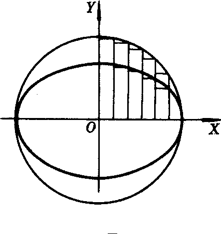 1上横坐标相同的各点作坐标轴的平行线,分别得到如图2所示的一系列矩形,属于椭圆和属于圆的相应矩形面积比是b:a.圆和椭圆的面积可以看作是相应的矩形面积的和在矩形底面趋于零时的极限,两个极限的比也是b:a,而