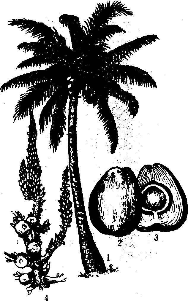 椰 子 1. 植株; 2. 果实; 3. 果实纵剖面; 4. 花序 椰子需高温环境, 以年平均气温27℃左右, 年降水量1300~2300毫米、地下水位1~2米、相对湿度80~90%、海拔高度低于100米的地区最适, 中国年平均气温23℃的地区也适宜种植, 15℃以下的低温持续时间长会影响产量。对土壤要求不严, 以肥沃的冲积砂壤土最好,砖红壤、砂壤土和珊瑚土,pH5~9适宜。 主要品种 椰子用种子繁殖, 多异花授粉, 变异大, 分类较难。1949年纳拉扬纳(G.V.Narayana)和约翰(C.M.John.)按植株高矮和授粉形式分为两个类型,即高种椰子(Tall Types)和矮种椰子(Dwarf Ty-pes)。后来,里扬纳吉(D.V.Liyanage)认为有一个中间类型(var.anramfiaca)。 高种椰子植株高达20米, 树干基部膨大(称“葫芦头”), 异花授粉, 植后7~8年开花结果, 产量高, 椰肉厚,质量好,含油率高, 经济寿命长达70~80年。主要变种有❶蒂皮卡(var. typica)。是主要商品栽培种。 ❷斯皮卡塔(var.spicuta)。花序不分枝或少分枝, 印度尼西亚称穗状椰子。 ❸安得罗佩纳(Andropena)。花序多分枝。 ❹马卡普纳(Makapuna)。因果腔充满可口松软的胶状体,又称实心椰子。 ❺塔格纳姆(Tagna-nam)。未成熟的椰子果皮甜,可食,又称甜皮椰。 矮种椰子高5~10米,自花授粉, 植后3~4年开花结果, 果小而多, 椰肉软而薄, 含油率低, 经济寿命30~40年。主要作鲜果、杂交亲本和观赏用。由于果实和叶片颜色不同, 又有红矮、黄矮和绿矮之分。主要有两个变种: ❶那那(var. nana)。植株矮小。 ❷爪哇尼卡(var. javanica)。树干较粗壮, 果实较大。 中间类型植株高度介于前两类型间, 植后7~8年结果, 自花授粉, 椰肉薄而软, 水多而甜, 主要作鲜果和观赏用。 栽培技术要点 用椰果繁殖,催芽育苗。海南高种和矮种椰子采果后40~50天发芽。西非高种和PB121杂种需90~100天才发芽。当芽长约20厘米时移入苗床或容器育苗。苗龄8~12个月、苗高80~100厘米即可选羽裂早、茎粗、叶脉明显、无畸形的壮苗在雨季初期定植。一般高种椰子每公顷植150~180株, 杂交种200~210株, 矮种椰子225~240株。植株3年生以前生长慢, 抗性差, 要及时除草施肥, 并防兽害。为充分利用土地, 可间种咖啡、可可、胡椒等作物, 也可间作豆科绿肥;或在行间种植热带葛藤等覆盖植物,以保持椰园水分, 并增施氮、磷、钾肥, 促使椰子速生快长。 中国椰子病虫害不严重, 主要有二疣犀甲为害心叶, 严重时破坏生长点, 致植株死亡。其他产椰国家严重病害主要有: 败生病, 为慢性毁灭性病害, 发现于菲律宾, 病因不明, 难防治; 致死性黄化病, 为急性毁灭性病害, 病原为类菌质体, 发现于加勒比海地区; 致死性萎蔫病,维管束被一种雏体鞭毛虫阻塞,致叶片枯萎、植株死亡, 发现于巴西、南美诸国, 无有效防治方法。在引种时必须注意上述病害的检疫。 经济价值 每100克椰子肉中含碳水化合物15克,蛋白质近5克, 维生素B1173微克, B5103微克,α-生育醇700微克, γ-生育醇750微克。主要加工成椰干、椰丝、椰块、椰片和椰油, 作糕点和糖果的原料。椰油可作食用油和人造奶油, 也可制优质肥皂, 其副产品甘油含量达12~13%。椰汁营养丰富, 可作清凉饮料。20世纪60年代以来, 用新鲜椰子湿法加工生产椰蛋白、椰奶粉、无色椰子油、椰子粉等。椰果纤维可制绳索、扫把和地毯, 和橡胶并用加工床垫、沙发垫和汽车坐垫。椰壳可加工活性炭、制乐器和椰雕等。椰树质硬花纹美, 可作家具和建筑用材。椰子综合利用的产品已达360多种。 椰子Yezi棕榈科。乔木,高15—30米。叶大,簇生茎顶,羽状全裂,长3—4米,裂片线状披针形,长50—100厘米,宽3—4厘米。肉穗花序腋生。核果近球形,长15—25厘米,外果棕褐色,中果厚而纤维质,内果皮骨质,近基部有3个萌发孔,内含种子1粒,种皮薄,紧贴白色坚实的胚乳,胚乳内有1富含液汁的空腔。广布于热带海岸。我国海南、台湾、云南有栽培。喜高温多雨,富含腐植质的土壤生长良好。深根性,能抗风,是优良海岸防护林树种和优良绿化树种。果为热带著名佳果;椰肉(胚乳)可榨油,供食用、制高级肥皂、化妆品、机械润滑油、合成橡胶等;胚乳制成椰干、椰丝,供制糖、糕点;椰汁制饮料;椰棕(中果皮纤维)供制扫帚、地毯、绳索;内果皮供制器具、工艺品及烧活性炭;叶可编席;木材可作梁柱或伞柄;根可提染料或入药;花序可制沙糖,全身无一废物,有“宝树”之称。 椰子Cocosnucifera单子叶植物,棕榈科。生长在热带沿海的一种常绿乔木,原产马来西亚。茎无分枝。树皮淡灰色。顶端生有很多大的羽状复叶。果实球形、椭球形或三棱形,直径约有20~30厘米。外果皮是薄硬的壳,中果皮是一层较厚纤维,内果皮木质坚硬,果腔里有1层白色胚乳,叫“椰肉”,可吃,味道甘美,芳香滑脆,含有丰富的脂肪和蛋白质。椰子糕、椰蓉月饼即以椰肉为原料制成。也可榨油。中间贮存有白色椰汁(椰乳),是一种清如水、甜如蜜的纯洁饮料。风味独特,营养丰富,含有糖类、脂肪、蛋白质、维生素C和磷、钙、铁、钠、钾等矿物质。最适于老年人饮用。我国海南省、西沙群岛、雷州半岛、台湾南部、云南西南部都有分布。