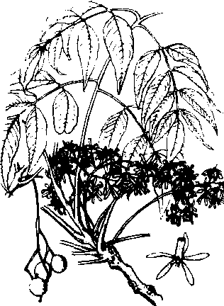 | 释义 | 楝树China berryMelia azedarach,别名苦楝、雀楝、楝枣子。楝科楝属落叶乔木。染色体数2n=28。高15~20m,胸径可达1m,树冠伞状广卵形,树皮纵裂。小枝绿色,皮孔明显;2或3回奇数羽状复叶,互生,小叶卵状椭圆形至披针形,长3~7cm,边缘具钝锯齿;圆锥花序腋生,花紫色,径约2cm,芳香,花期4~5月;核果椭圆形或近球形,淡黄色,果熟期10~11月。产中国河北中部以南,东至山东、江苏、台湾,南至海南,西至四川、云南及甘肃,印度、缅甸也有分布。喜阳光充足及温暖湿润气候,不耐寒。对土壤要求不严,在酸性土、钙质土及含盐量在0.46%以下的盐渍土壤上均能够生长;不耐旱,怕积水。对二氧化硫抗性强。楝树侧根发达,抗风,萌芽力强,生长迅速。播种繁殖。冬播或将种子贮藏至翌年春播。为培养直立主干,可在3~4年生时进行平茬,能培养成4~5m高的主干。楝树的病虫害较少,有时有溃疡病、红蜘蛛及介壳虫等。 楝树China berry-treeMelia azedarach L.,又称苦楝,楝科,楝属。落叶乔木,高达20 m。2~3回羽状复叶,互生,长达40 cm;小叶卵状披针形,长3~7 cm,宽2~3cm,叶缘有钝锯齿。圆锥花序腋生;花紫色或淡紫色,5出数;雄蕊花丝合生成筒。核果卵圆形或近球形,长1.5~2 cm,淡黄色。北自河北,南至广东、海南,东起台湾,西至甘肃,均有栽培和野生。喜光,幼苗稍耐庇荫。喜温暖气候,不耐寒。不耐干旱,怕积水。根、皮、果入药能驱虫、止痛。木材纹理美观,易加工不变形,抗虫,可供建筑、家具、箱柜、乐器、枪柄等用材。