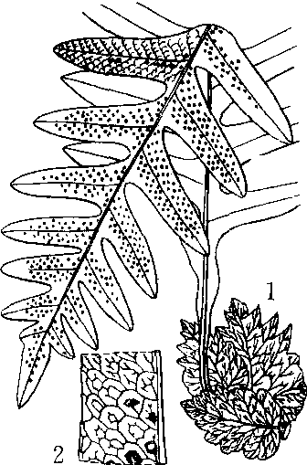 槲蕨 1.植株全形 2. 裂片一部分,示叶脉及孢子囊群 |
