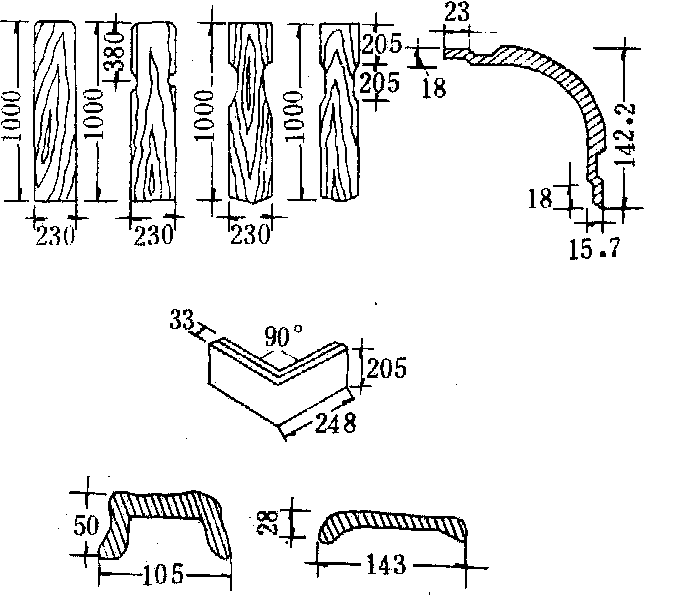图3 部分建筑构件截面形状 ![]() 图4 部分家具部件截面 板、散热器罩、门扇窗台等;家具部件(图4),如各式台面、椅子靠背和餐盘等;包装器材,如托盘和水果箱等;工业配件,如电视机壳、电冰箱壳、汽车部件和浮雕工艺品等。 通用模压法的工艺流程是: 削片→打磨→干燥→分选→称量→拌胶→铺装→预压→热压。刨花模压制品的原料既可用木刨花,也可用甘蔗渣和亚麻屑等。 模具是刨花模压制品生产过程中的关键设备,预压模将施过胶的刨花冷压(少数热压)成形状与产品相近的毛坯,热压模进一步热压毛坯为成品。根据需要,可在热压过程中同时进行表面加工处理,如覆贴浸渍树脂的胶膜纸。典型的热压模有凹模、凸模、导向、加热、排汽、留料脱膜等装置。 |