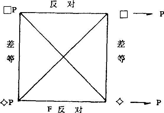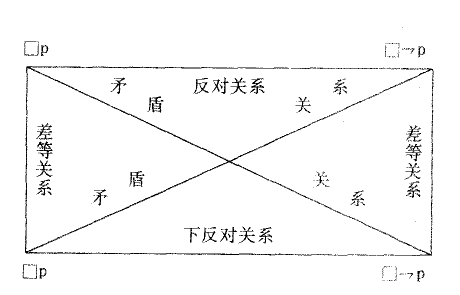 ❸□p与◇p·□⇁P与◇P之间是差等关系。具有差等关系的两个模态判断之间,如果必然判断真,则可能判断必真;如果必然判断假,则可能判断真假不定;如果可能判断假,则必然判断必假;如果可能判断真,则必然判断真假不定。例如,由“作案人必然是他”(必然p真),可推出“作案人可能是他”。(可能p真);但不能由“作案人可能是他”推出“作案人必然是他”。 ❹◇p与◇⇁p之间是下反对关系,二者不能同假,可以同真。如果一假时,另一个必真;如果一个真时,另一个则真假不定。如由“老李明天不可能来”(可能p假),可推知“老李明天可能不来”(可能非p真)。却不能由“老李明天可能不来”推出“老李明天不可能来”。 模态方阵传统逻辑中刻划4种基本模态判断之间真假关系的逻辑图形: