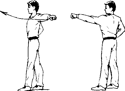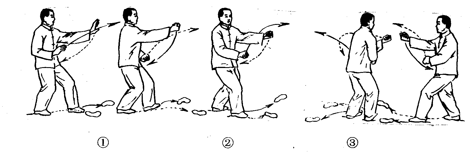 横拳 横拳形意五行拳之一。为左右斜向前进,拳向斜前方弧形打出的动作。横拳是形意拳的主要拳法。古拳谱中载有“横拳形圆性实,其气顺则五行和……”之说。动作过程:由三体式开始。右横拳:两掌变拳握紧,然后左脚向左前方斜进一步,右脚随之跟进半步,成三体式步;同时右拳前臂外旋由胸前经左肘下方向左脚前进方向弧形打出,拳心由下转向上,高与胸平,力达拳面及前臂;左拳随之撤至左侧腹肋处,拳心向下;目视右拳。(图2—4—68—