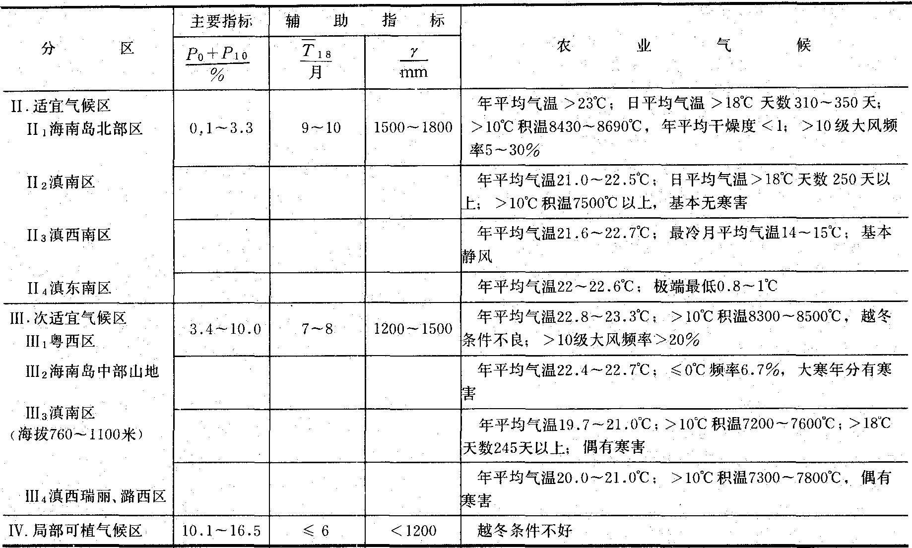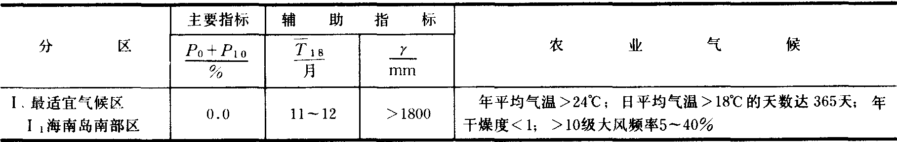 根据橡胶树的农业气候指标制定的农业气候区划。中国橡胶树分布在南起北纬18°14′ (海南岛崖县), 北至25°N(云南保山县的怒江农场)之间。包括广东、云南、广西、福建及台湾省南部, 区划工作只考虑主产地广东、云南南部。以橡胶树低温寒害指标作为划区的主要指标,其中两项具体指标为:❶极端最低气温≤0℃出现机率P0(%); ❷日平均气温≤15℃的阴冷日在20天以上 (两次阴雨天气过程间隔期3~5日), 期内平均气温≤10℃过程的出现机率P 10(%)。以上两种指标如出现一次, 橡胶树严重寒害率即可达30%以上。辅助指标是: 以月平均气温≥18℃的月数亍18作为橡胶树生长期长短的指标, 以年降水量γ作为水分指标。具体区划见表。