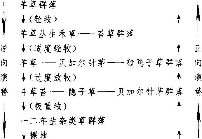 | 释义 | 次生演替系列secondary sere次生裸地或原生植被群落开始的植物群落中,顺序发生一系列的演替群落阶段。包括植物群落退化和复生两个过程。原生群落在外界因素(如垦殖、放牧、火烧)及其他灾害作用下,由较复杂、相对稳定的阶段向较简单和相对稳定性较差的阶段退化。当外界因素作用停止后,又趋向恢复到破坏前的原生群落类型。次生演替经历阶段及速度,决定于外界因素的作用程度和持续时间。如羊草草原长期放牧,牧草高度降低,草被破坏,土壤沙化。放牧停止后.草地得以休养牛息,逆向演替转向正向演替,其次生演替系列如下图: