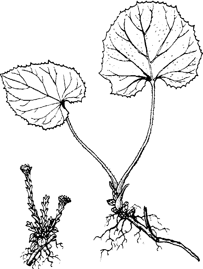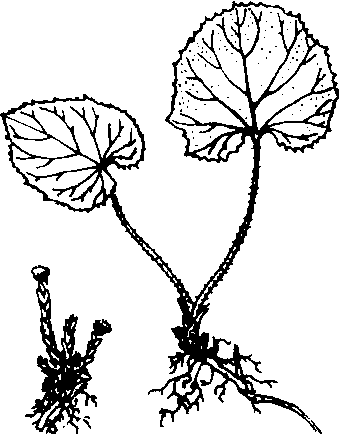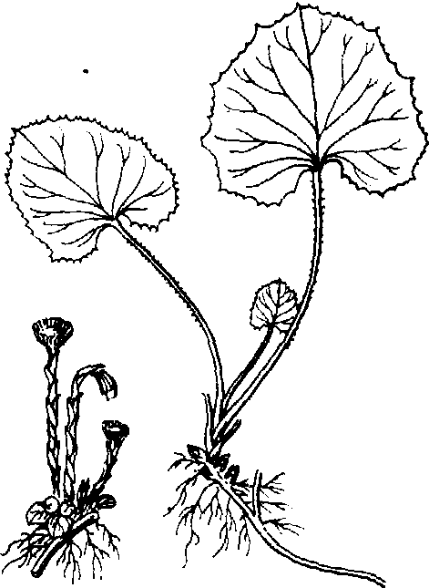 款冬common coltsfootTussilago farfara L.,又称蜂斗菜。菊科,款冬属。多年生草本。2n=3x=87。生于背风向阳湿润地带。分布中国黄河流域以南地区;欧洲、北非和亚洲的其他国家也有分布。具横生根茎,褐色。叶丛生,阔心形,边缘有波状疏齿,叶背密生白色茸毛;冬季褐色花茎先叶抽出,被白茸毛,上有多枚鳞片叶,互生。头状花序顶生;缘花舌状.多数,雌性,黄色,柱头2裂;盘花管状,两性,花柱头状。花果期1~2月。花蕾入药称“款冬花”或“冬花”,性温、味辛,功能润肺、下气,主治咳嗽气喘、痰咯不畅、咳血等症;叶柄菜用。