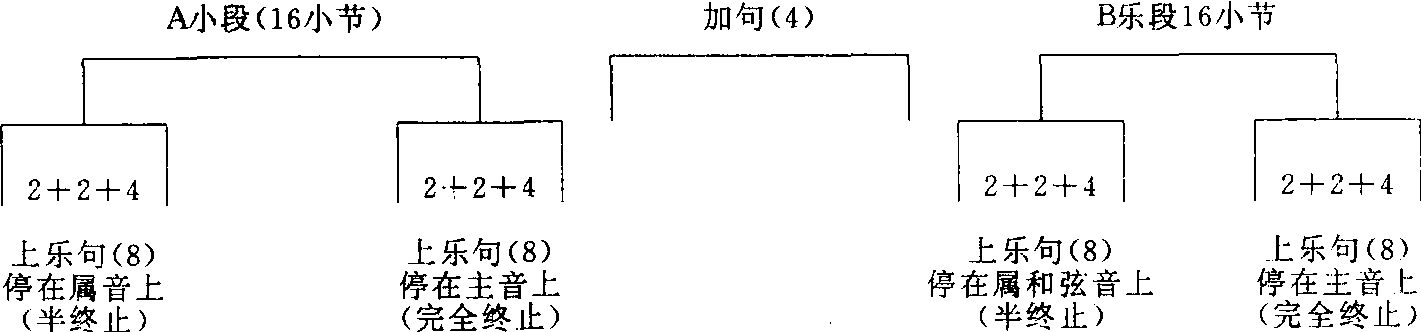 除上两首歌曲为一段体和二段体结构外,还有三段体(a,b,a)曲式及多段体曲式结构。 |