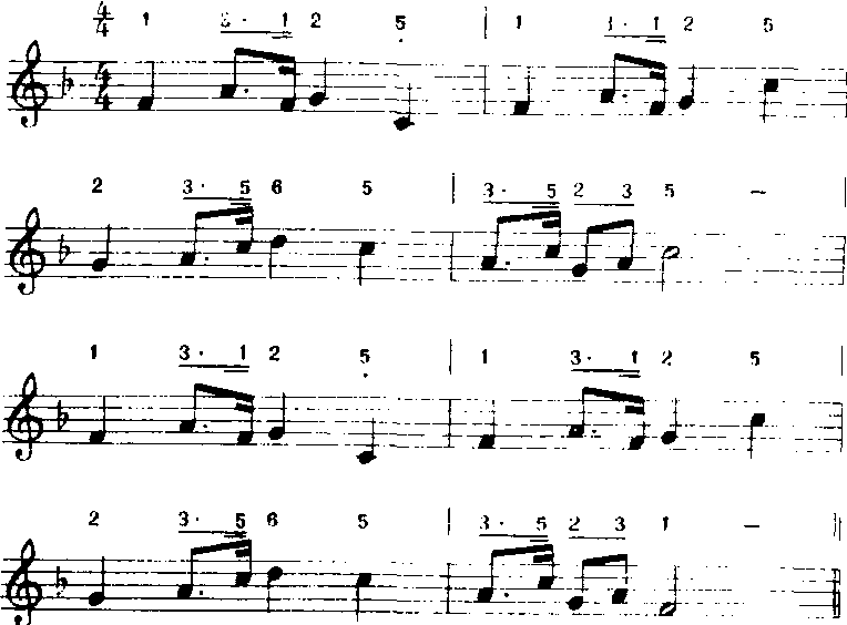 乐句:由两个乐节组成一个乐句,乐句已经能够完整的表达某种音乐思想,像讲话一样,已经是一句完整的语句了。乐句多数为四小节,也有少数为八小节的乐句。乐句又可分为上乐句和下乐句,上乐句像问话停留在半终止和弦(Ⅴ级和弦)上,下乐句像答话停留在终止和弦(Ⅰ级和弦)上,上下乐句互相呼应、互相补充,把音乐思想表达得更加完整。 乐段:一般由上、下两个乐句构成,也有少数三个乐句构成的,它已经能表达完全的音乐思想。结构完整。可以独立存在,一般由主和弦(Ⅰ)收束,有明显的收束感,一般乐段为八小节,也有少数为十六小节。下面就儿童歌曲《共产儿童团》的曲体结构,作如下分析:《共产儿童团》由八小节组成,可分成上、下两个乐句各四小节,上乐句停在属音“sol”上,为半终止,它第一小节为动机(四拍),第二小节也是一动机(四拍),第三、四小节中间不能分开可认为是一个“乐节”(也有称“乐汇”)。下乐句四小节停在主音“do”上,为完全终止 其中也包括第一小节动机,第二小节动机,第三、四小节为一个乐节。因此上下两个乐句共同组成一个完整的八小节乐段。本歌为一段体歌曲。现再举一个《我擦好了三八枪》歌作曲体结构分析如下: