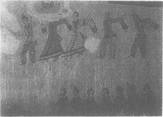 | 释义 | 歌舞图壁画高句丽(公元4世纪)。纵130厘米,横150厘米。吉林省集安县舞踊墓墓室东壁右侧壁画。舞者一行五人,服装花色相同,均带有黑点,其中三名穿长袖花衣,束脚花裤;另外两名着对襟花裙。他们在跳集体舞,均一臂向后伸举,长袖飘拂,舞姿优美典雅。舞者下方有七名男女歌手在伴唱。左方有一骑马人,正在观赏歌舞,可能是墓主人。此图风格古拙,线条朴素,具有鲜明的民族特色。