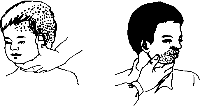 ❷颌外动脉指压止血法。在下颌角前1.5厘米处用拇指指腹将颌外动脉压向颌骨即可。它适用于同侧面部出血(图2)。