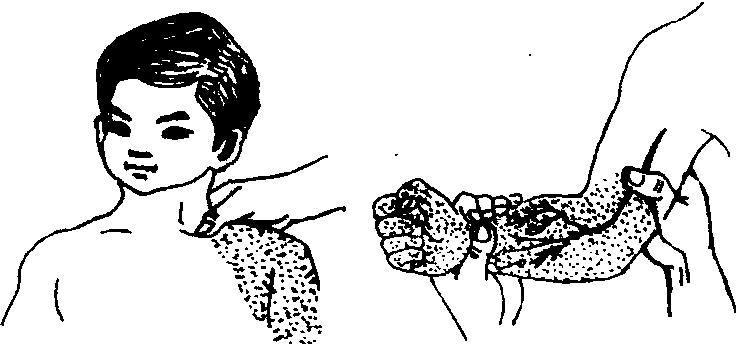 指压法 在出血部位的近心端选择适宜的压迫点,用拇指将出血的血管压向相临的骨骼,即可达到止血目的。一般适用于动脉出血。常用的压迫止血点及操作方法是:❶颞浅动脉指压止血法。用一手固定患者的头, 用另一手的拇指指腹在出血一侧耳屏前的下颌关节处,轻轻将颞浅动脉压向颞骨,此法适用于前额部及颞部出血(图1)。