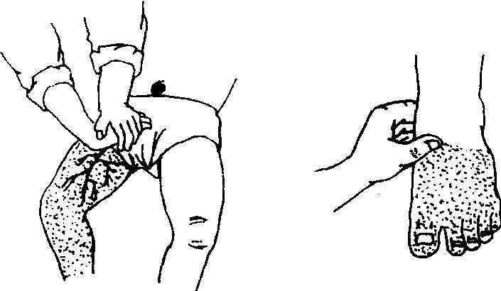❺股动脉指压止血法。伤员仰卧,患侧大腿稍外展外旋,在腹股沟中点稍下方摸到动脉搏动后, 再将两手拇指重叠一起压向股骨即可。它适用于大腿、小腿出血的指血(图5)。