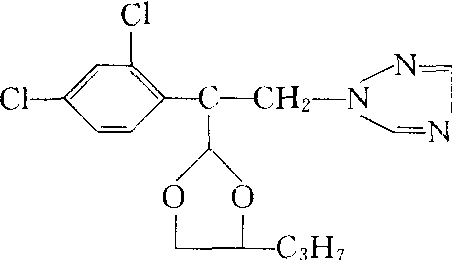 | 释义 | 丙环唑propiconuzole又称环氧三唑。杂环类杀菌剂。化学名称:1-〔2-(2,4-二氯苯基)-4-丙基-1,3-二氧戊环-2甲基〕-1-氢-1,2,4-三唑。化学结构式如下。原药为黄色稠液体,在13.33 Pa下沸点为180℃,20℃时 水 中 溶 解 度110 ml/L,易溶于大多数有机溶剂,贮存稳定性3年。广谱性内吸杀菌剂,对担子菌、子囊菌、半知菌中许多真菌引起的病害都有良好的防治效果,如小麦白粉病、根腐病、条锈病、颖枯病、大麦叶锈病、网斑病、水稻恶苗病、葡萄炭疽病、白粉病、花生叶斑病及香蕉的多种叶斑病。由于具有良好的内吸性能,使用时可喷洒或浸种,具保护和治疗作用。残效期1个月左右,对人畜低毒,大鼠急性口服LD501 517 mg/kg,急性经皮LD50>4 000 mg/kg。对眼、皮肤有轻微刺激。