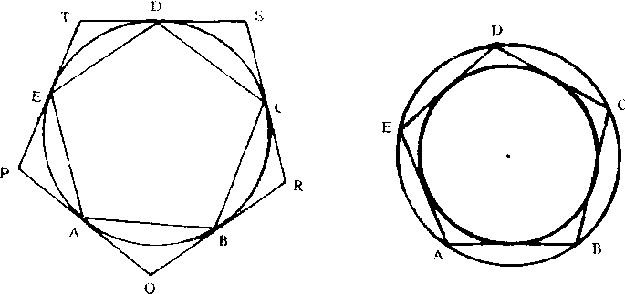 如果把圆分成n (n>2)份,依次连接各分点所得的多边形就是圆内接正多边形, 这个圆叫做多边形的外接圆;如果经过各分点作圆的切线,以相邻切线的交点为顶点的多边形就是圆外切正多边形, 这个圆叫做多边形的内切圆。例如, 图中的ABCDE是圆内接正五边形, PQRST是⊙O的外切正五边形。 任何一个正多边形都有一个外接圆和一个内切圆, 这两个圆是同心圆。如图, 大圆是正五边形ABCDE的外接圆, 小圆是正五边形ABCDE的内切圆。 ![]() |