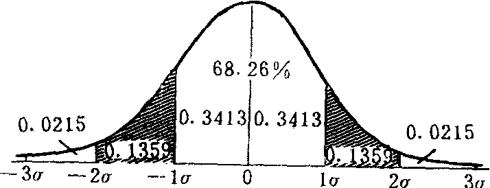 式中 Y——频率(相对次数) μ——总体平均数 σ——总体标准差 x——随机变量 π——常数(约为3.14159) exp——常数(约为2.71828) 从式中可见:正态分布曲线是由μ和σ所决定的;当μ与σ不同时,就有不同的正态分布曲线。若用z=x-μ/σ代入上式,即平均数为0、标准差为1时,则变为 ![]() 这就是标准正态分布。也就是我们通常所说的正态分布,其Y值可从正态曲线的纵线表中查到。 正态分布曲线有下列性质:❶曲线以z=0为中心,两边也对称; ❷曲线在z=0处有最大的频率(Y= =0.3989);❸曲线在z=±1处有两个拐点; ❹曲线下面的面积为1; ❺曲线两端向基线无限延长、接近基线,但永远不与基线相交。 正态分布下的面积与μ、σ有下列关系:以平均数为中心向两边各取1个标准差(即μ±σ),其范围约占总面积的68.26%;若向两边各取2个标准差(即μ±2σ),则其范围约占总面积的95.45%;若向两边各取3个标准差(即μ±3σ),则其范围约占总面积的99.73%。