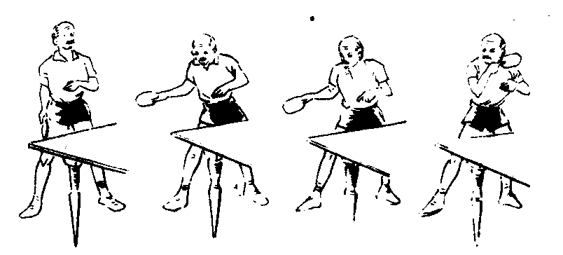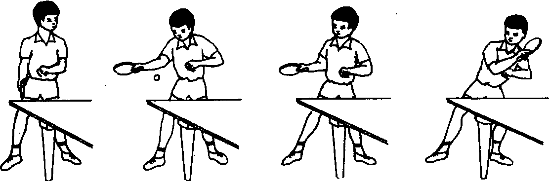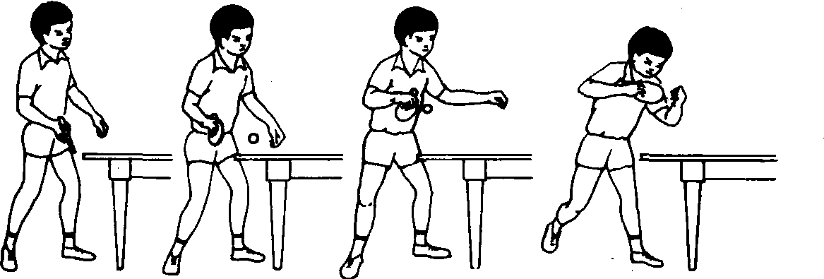 正手快攻正手攻球技术之一。指击球员站位近台利用正手迅速挥拍用力击球的一种进攻技术。其主要特点是球速快,动作小,线路活,可直接得分或为扣杀创造机会。击球时球拍引向身体右侧方,拍身呈半横状,拍面基本垂直或稍前倾。上臂带动前臂挥动并以前臂向上方发力为主,前臂旋内手腕控制拍面沿球体作弧形运动。在来球上升期用60~80%力量击球中上部。身体重心随击球向前移动,球拍随势前送至前额后迅速放松还原。老年人练习时,击球时间由高点期逐渐提前到上升期,由借力到发力,用60~80%力量击球。可攻1板球或一推一攻练习,体会拍形角度、拍面方向、发力方向和发力方法。记录1个球最高攻球板数。采用两人右方斜线(或其他基本线路)对攻练习,掌握手指手腕和前臂的协调配合。采用一人推挡一人作1/2台跑动攻练习。强调手法及步法的协调配合。增强老年人上下肢及全身的灵活性。(见图2—3—34)