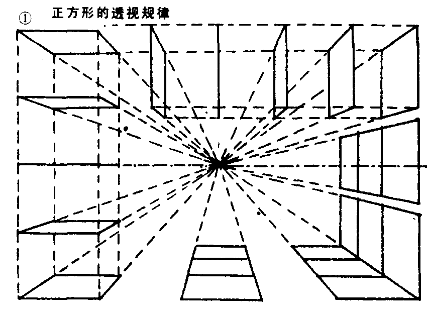 | 释义 | 正方形透视规律直立正方形:与画面平行的是原形,平行的上下左右移动不变形。从其侧面看时,上下两边要消灭而又近边长远边短。向远处移动则方形缩小。与画面垂直的正方形,正对心点时则成一直线。平置正方形:与眼睛等高时成一条平线;在眼睛以下的可见其顶面,在眼睛以上的可见其底面。当正方形的一个侧边正对心点时,则一边垂直另一边向中斜,中心正对心点时则左右对称。近看面积大,远看面积小(见图3❶)。